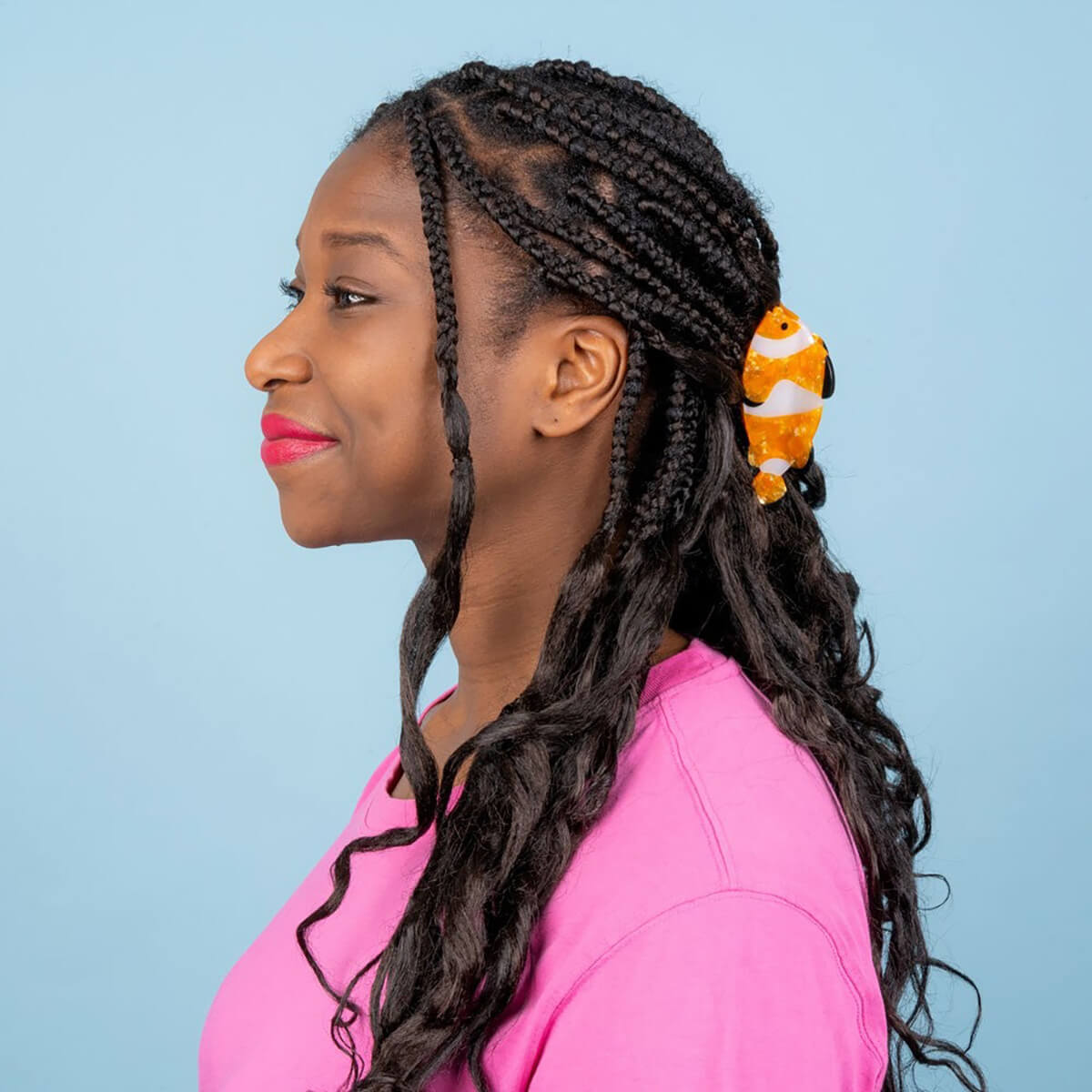 Clownfish Hair Claw by Coucou Suzette. We finally found Nemo! This beautiful clownfish hair claw with orange and white stripes is ready to jump into your hair. Featuring rhinestone eyes for a sparkling gaze.