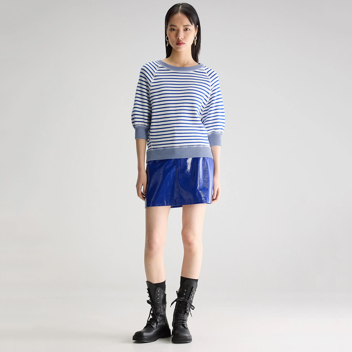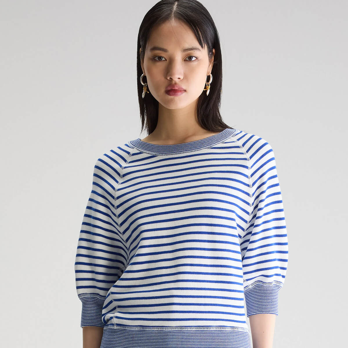 Anglet Crewneck Sweater by Bellerose. Oversized crewneck sweater with 3/4 sleeves and ribbed edges in striped cotton.