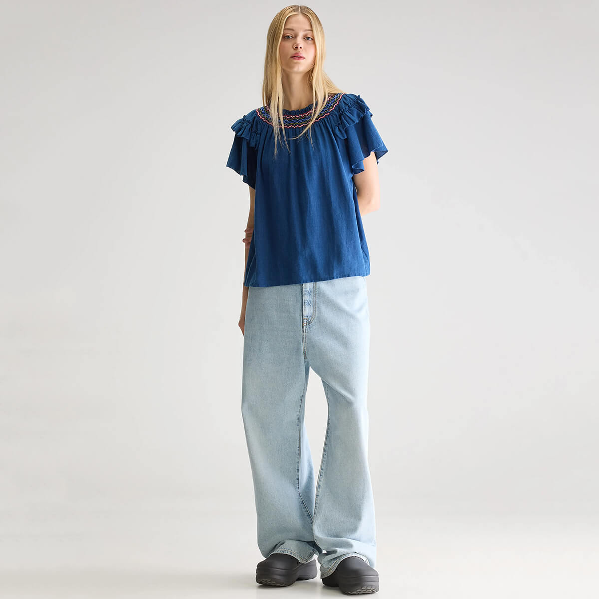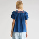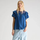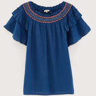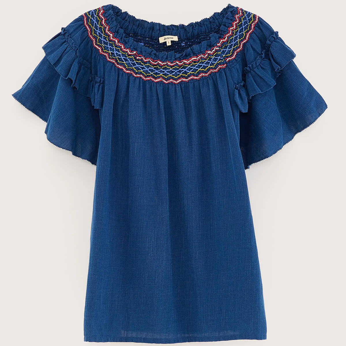 Cathy Blouse by Bellerose. Regular, navy blue blouse with colourful smocked embroidery along the neckline and butterfly sleeves with ruffle details.