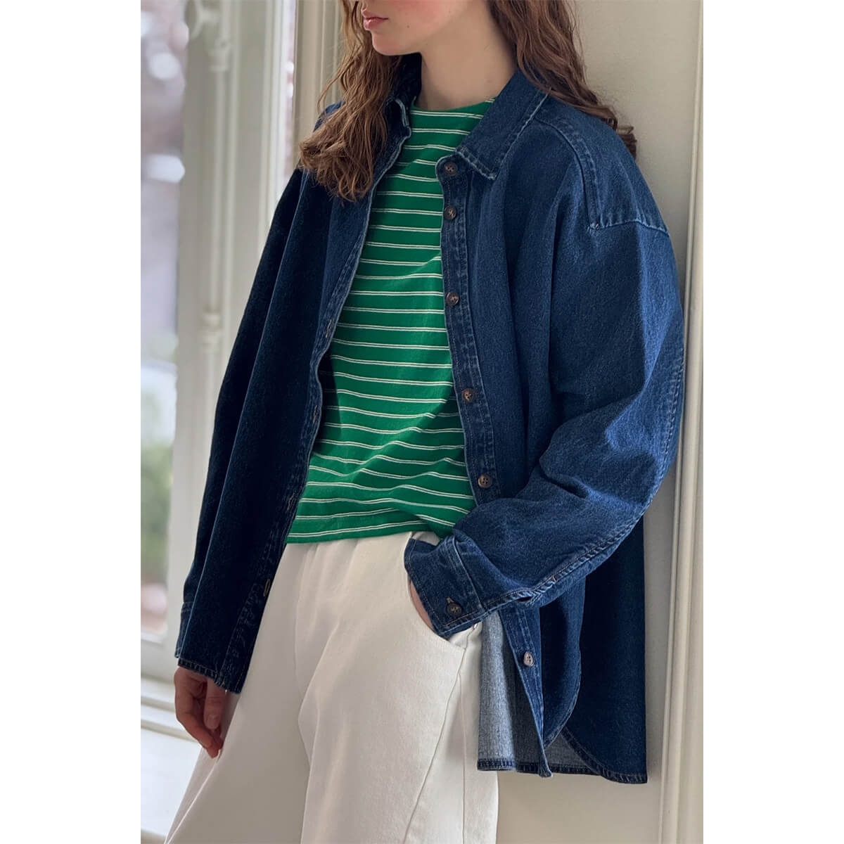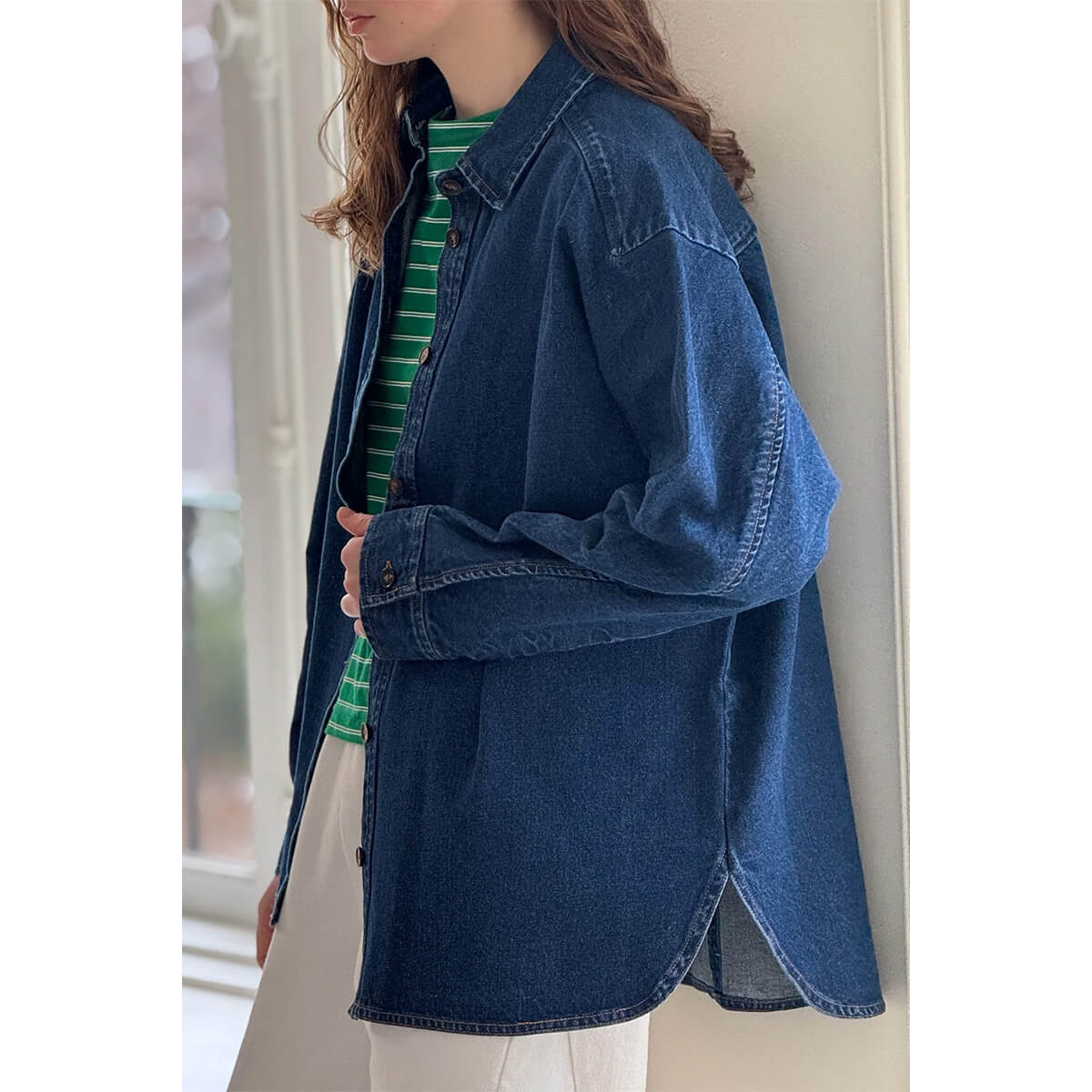 Owen Heavy Denim Shirt by Le Bon Shoppe. The classic denim shirt, reimagined. It fits like the perfect vintage '90s piece—slightly oversized and relaxed for easy layering, or wear it as a lightweight jacket. Made from 100% heavy cotton denim, it’s soft yet durable, ideal for both casual and elevated looks. Featuring functional buttons, contrast stitching, and a classic rounded hem, it's a timeless, versatile wardrobe essential that transcends time.