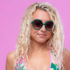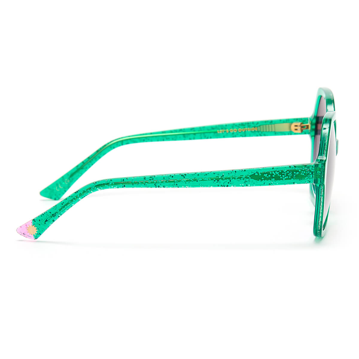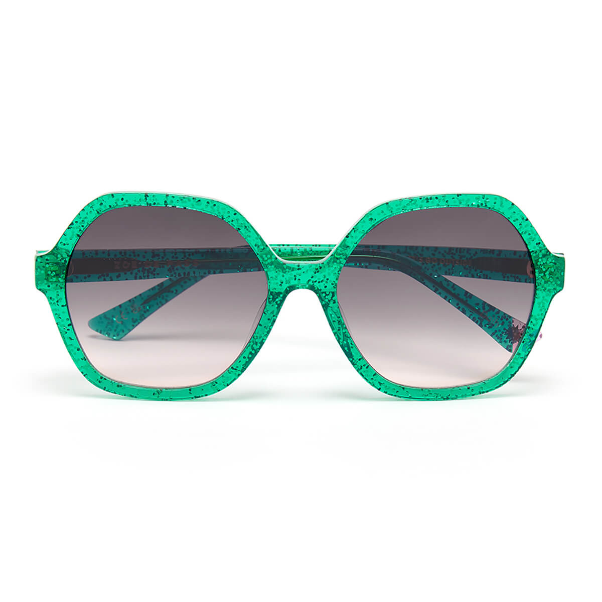 Dolly in Green Glitter by Zoë De Pass Eyewear. Shine bright in these Limited Edition sparkly green glitter hexagonal sunglasses—perfect festival (or every day) shades for bold, fun-loving fashion. These large, eye-catching sunglasses feature premium lenses and a playful design that suits all face shapes. Lightweight and comfortable, they add instant flair to any outfit. The ultimate glitter sunglasses for festivals, parties, and unforgettable summer moments.