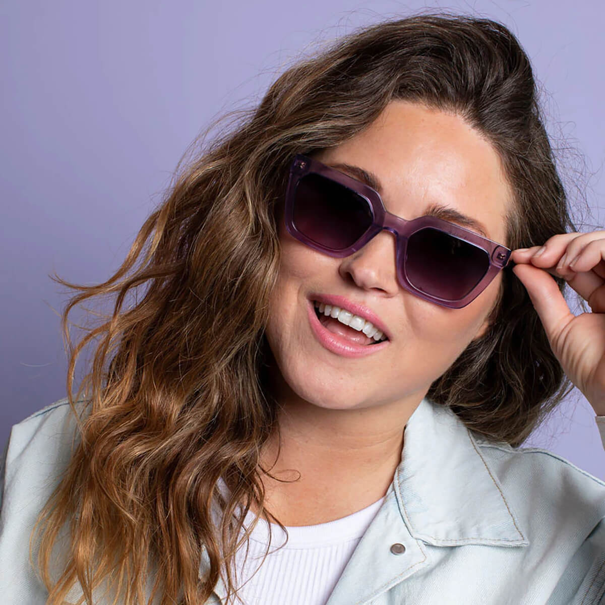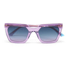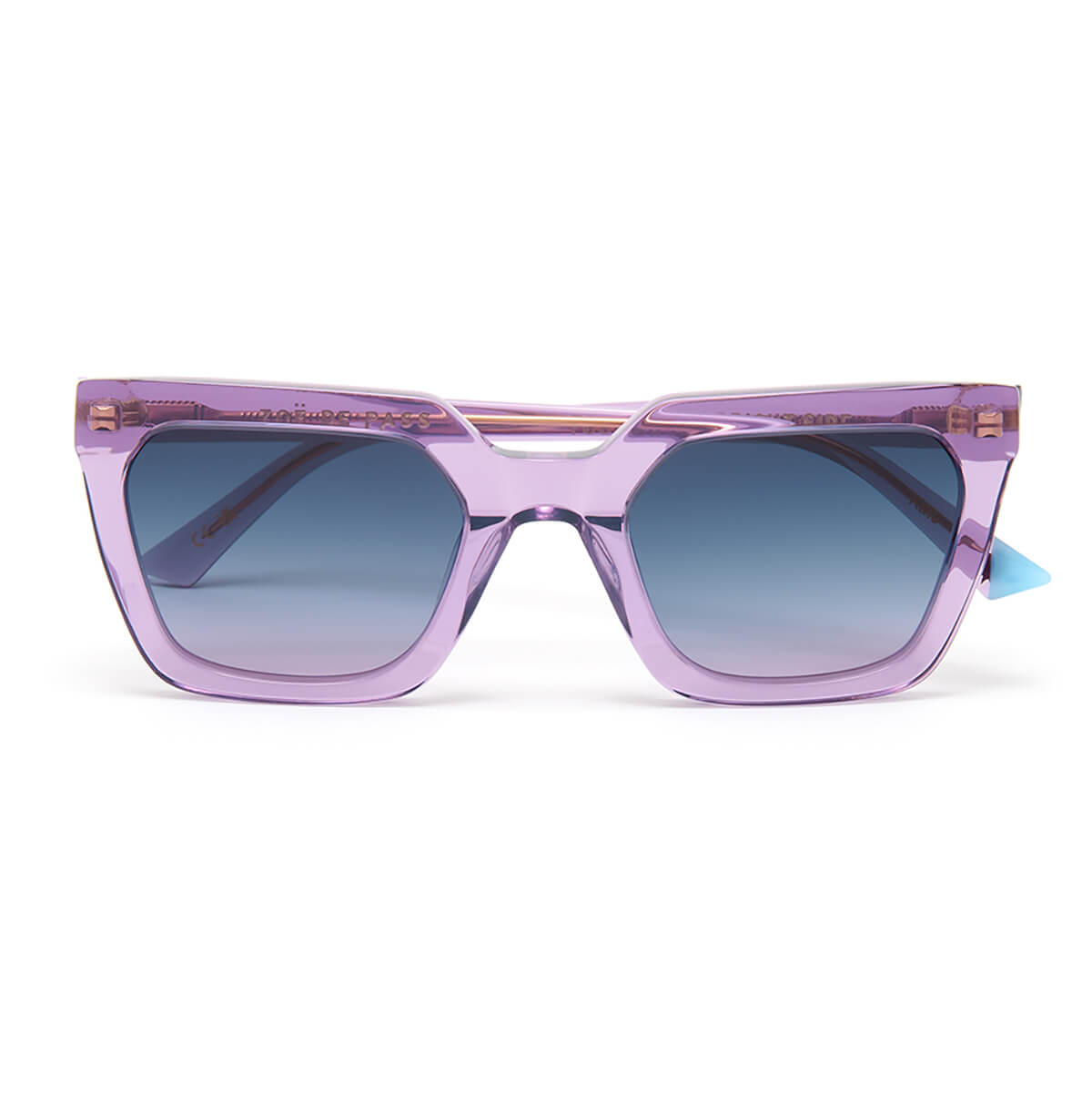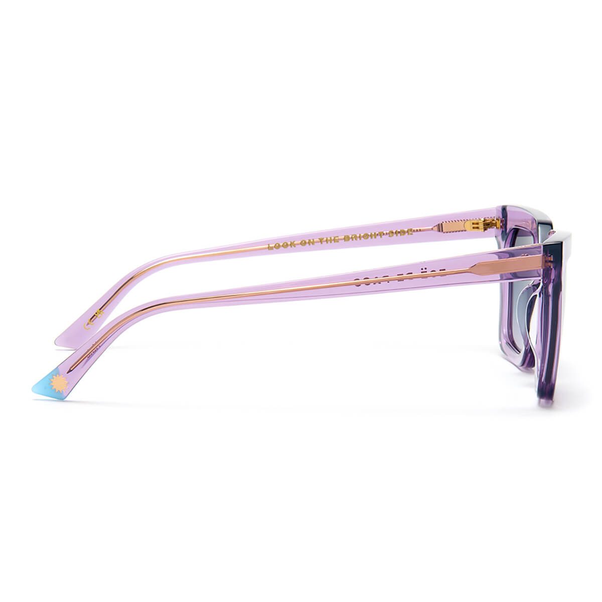 Kate in Amethyst by Zoë De Pass Eyewear. A must-have square cat-eye shape in a gorgeous purple. With curves in all the right places make it incredibly easy to wear, while the dusky purple crystal eco acetate adds a fresh touch. Universally flattering, this easy-to-wear colour complements all face shapes and skin tones, blending seamlessly into your wardrobe. The Kate's distinctive feature is the unusual blue-to-pink lenses, casting a cool and soft hue, adding mystique to this chic style.