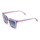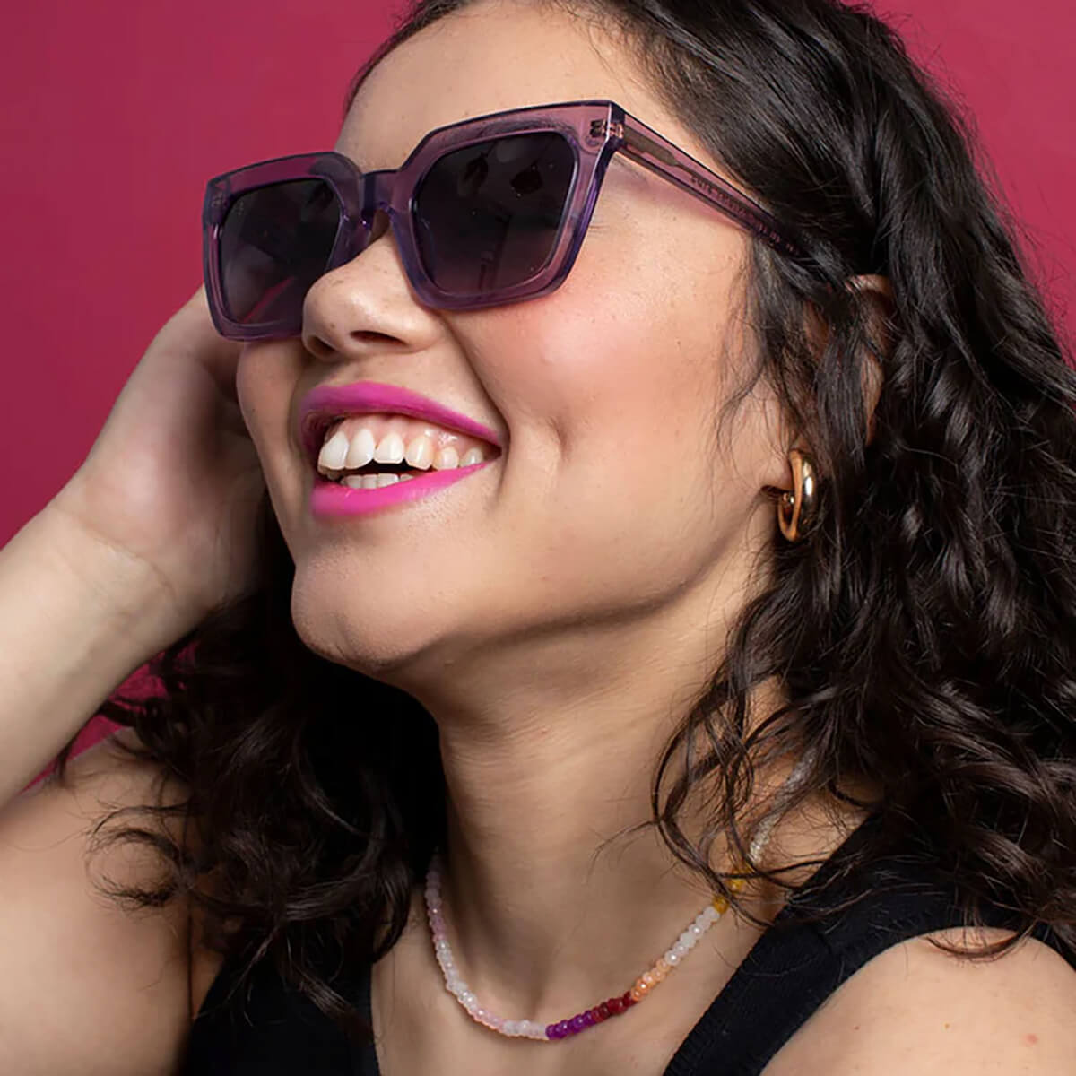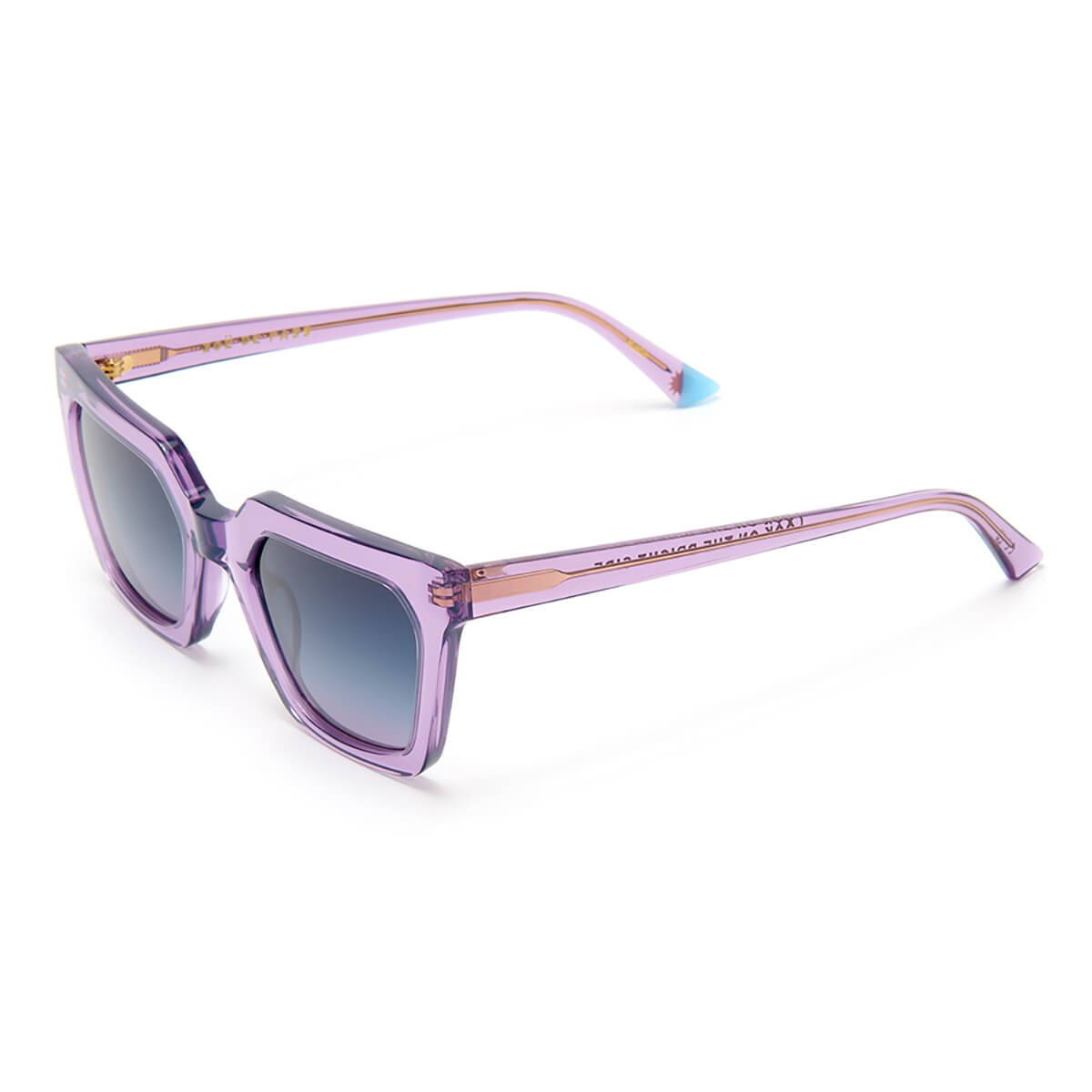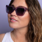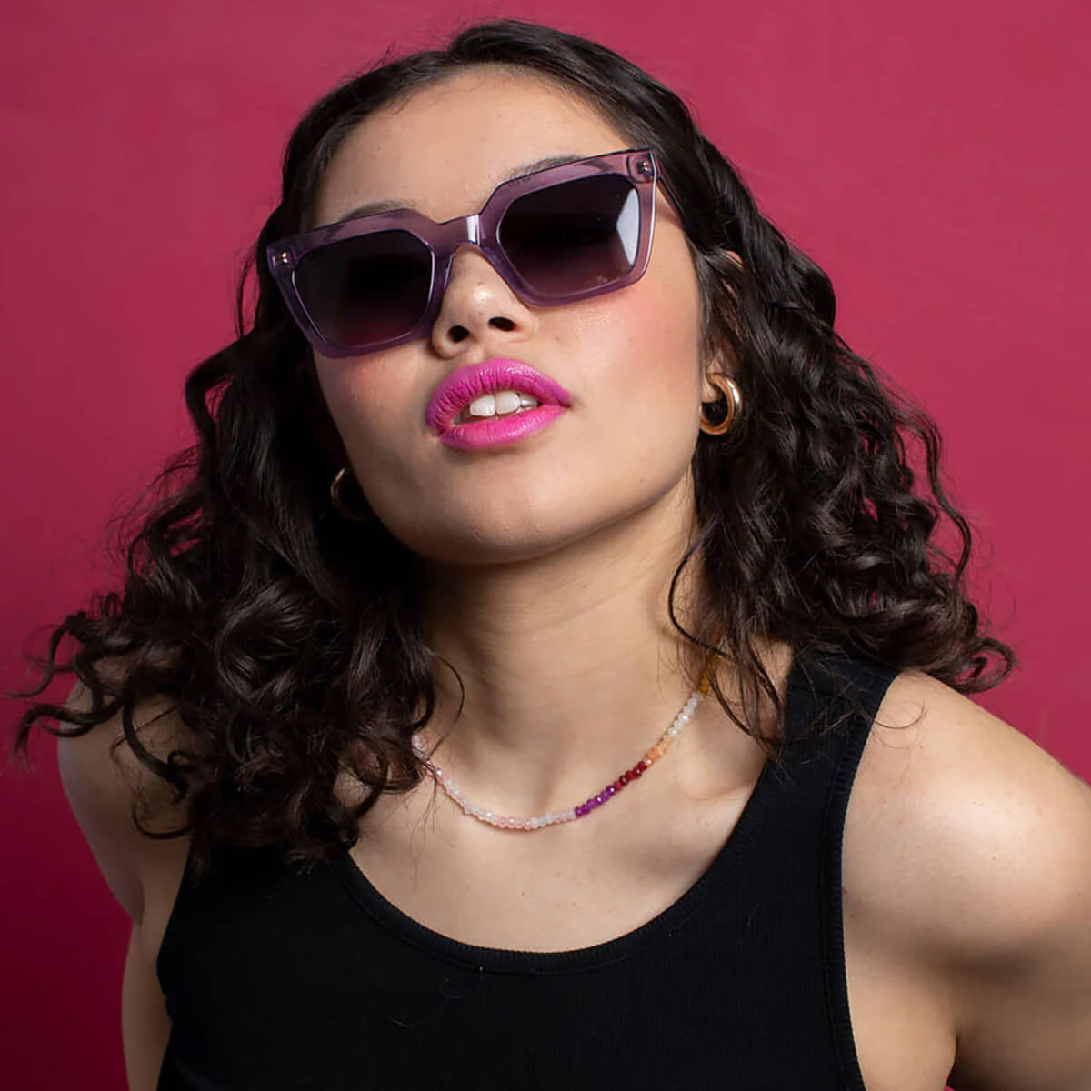 Kate in Amethyst by Zoë De Pass Eyewear. A must-have square cat-eye shape in a gorgeous purple. With curves in all the right places make it incredibly easy to wear, while the dusky purple crystal eco acetate adds a fresh touch. Universally flattering, this easy-to-wear colour complements all face shapes and skin tones, blending seamlessly into your wardrobe. The Kate's distinctive feature is the unusual blue-to-pink lenses, casting a cool and soft hue, adding mystique to this chic style.