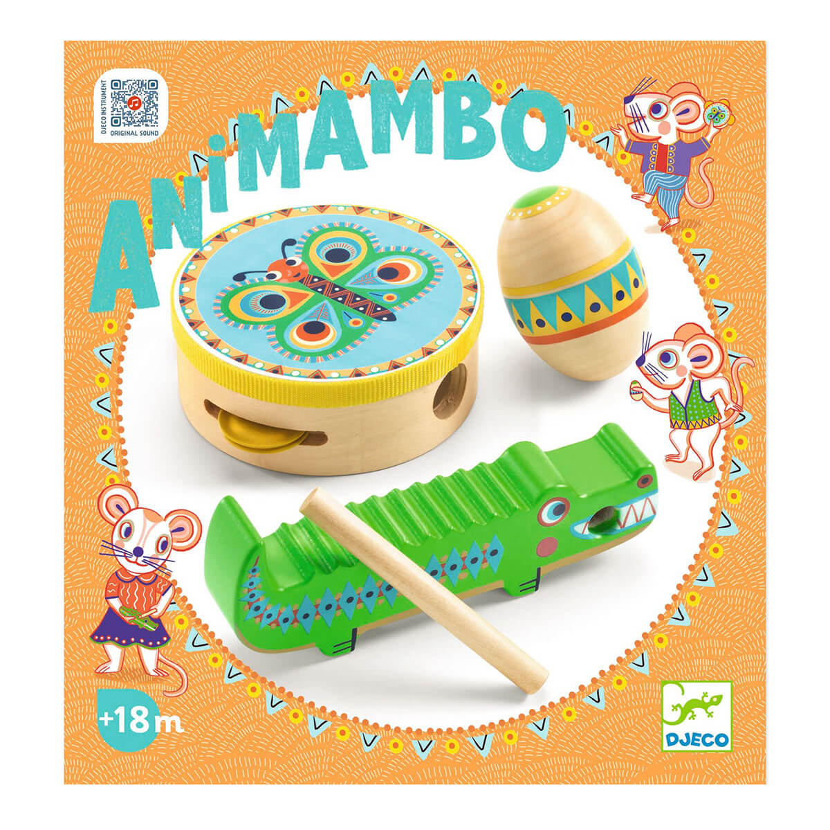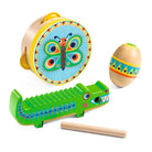 Animambo Wooden Music Set by Djeco. A superb set of three beautifully decorated instruments for little ones: a butterfly tambourine, an egg maraca and a crocodile guiro. The perfect present for introducing little ones to percussion instruments!