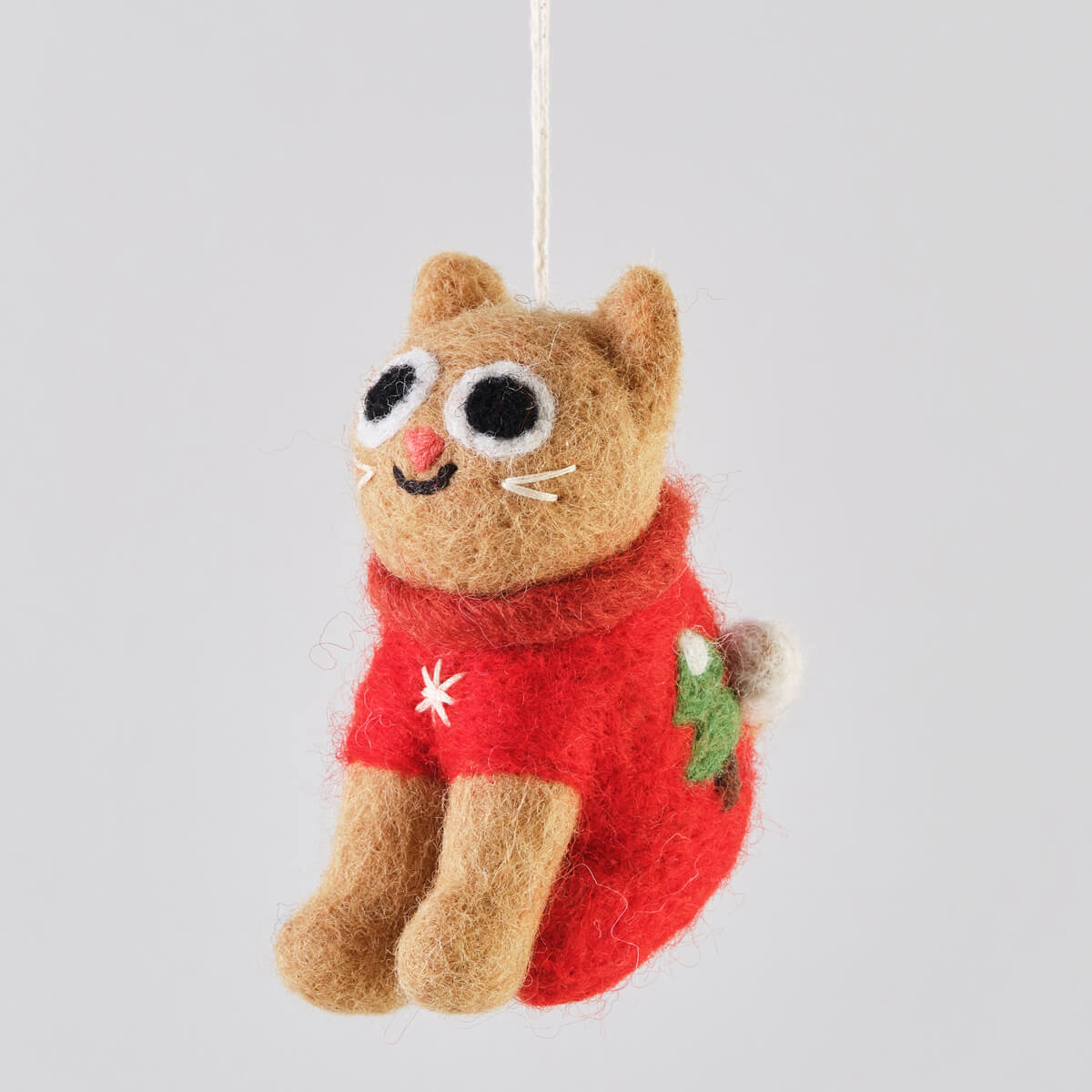 Esther Felt Decoration by Wrap. Hand needle felted hanging Christmas tree decoration. Esther is a sweet cat wearing a festive outfit.