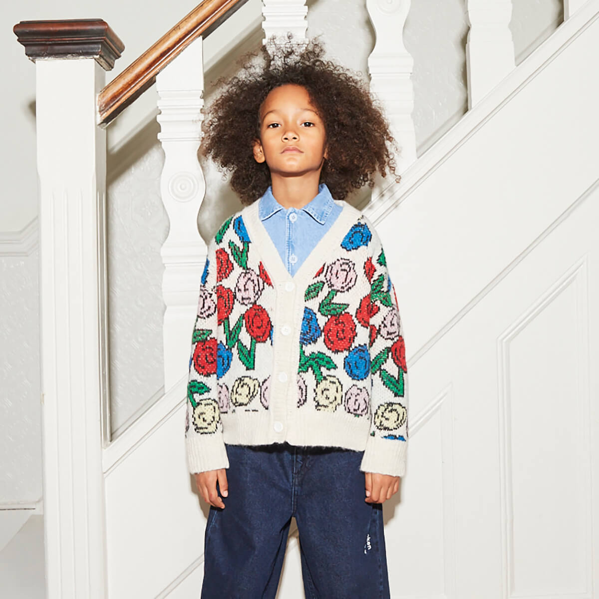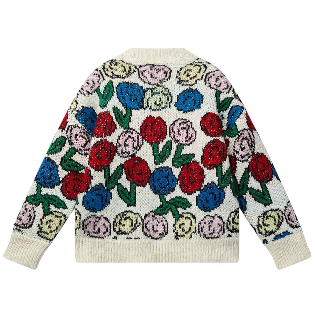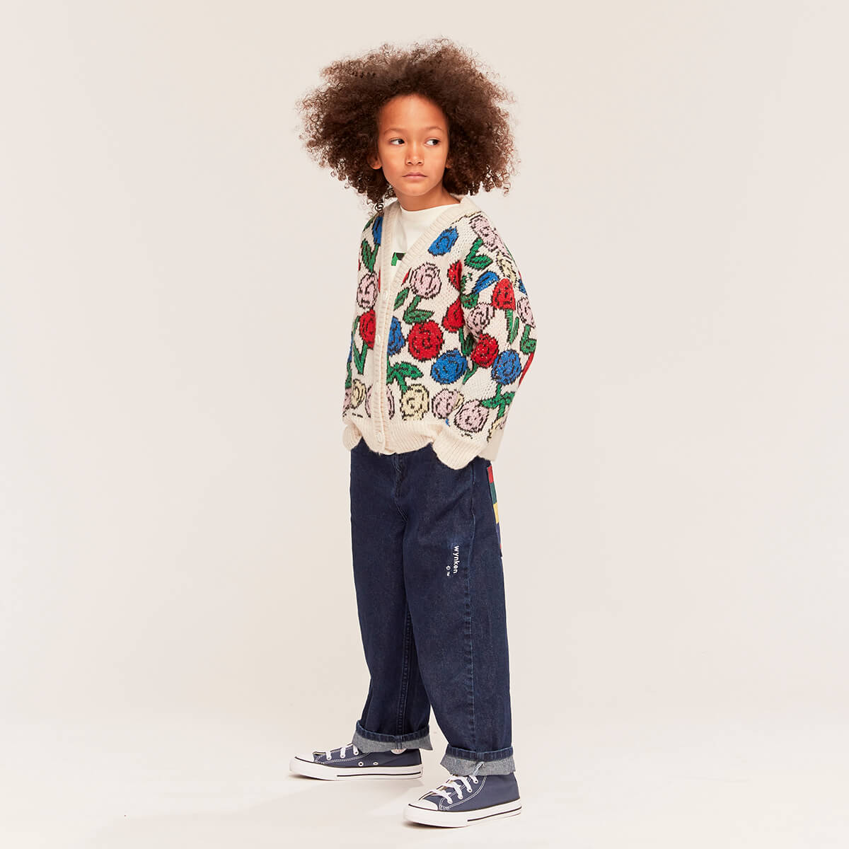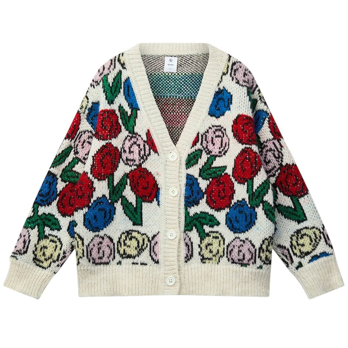 Kukka Cardigan by Wynken. Soft, cosy, and full of cheerful charm, this long-sleeve jacquard knit cardigan is crafted from a washable wool-blend using premium fibres from Italian spinners—chosen for their exceptional softness and durability. The vibrant all-over floral design is woven directly into the knit for a richly textured, long-lasting finish. With a relaxed fit and button-up front, it layers effortlessly over tees or shirts, adding warmth, colour, and a playful twist to everyday outfits.