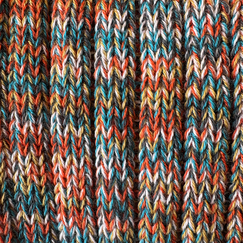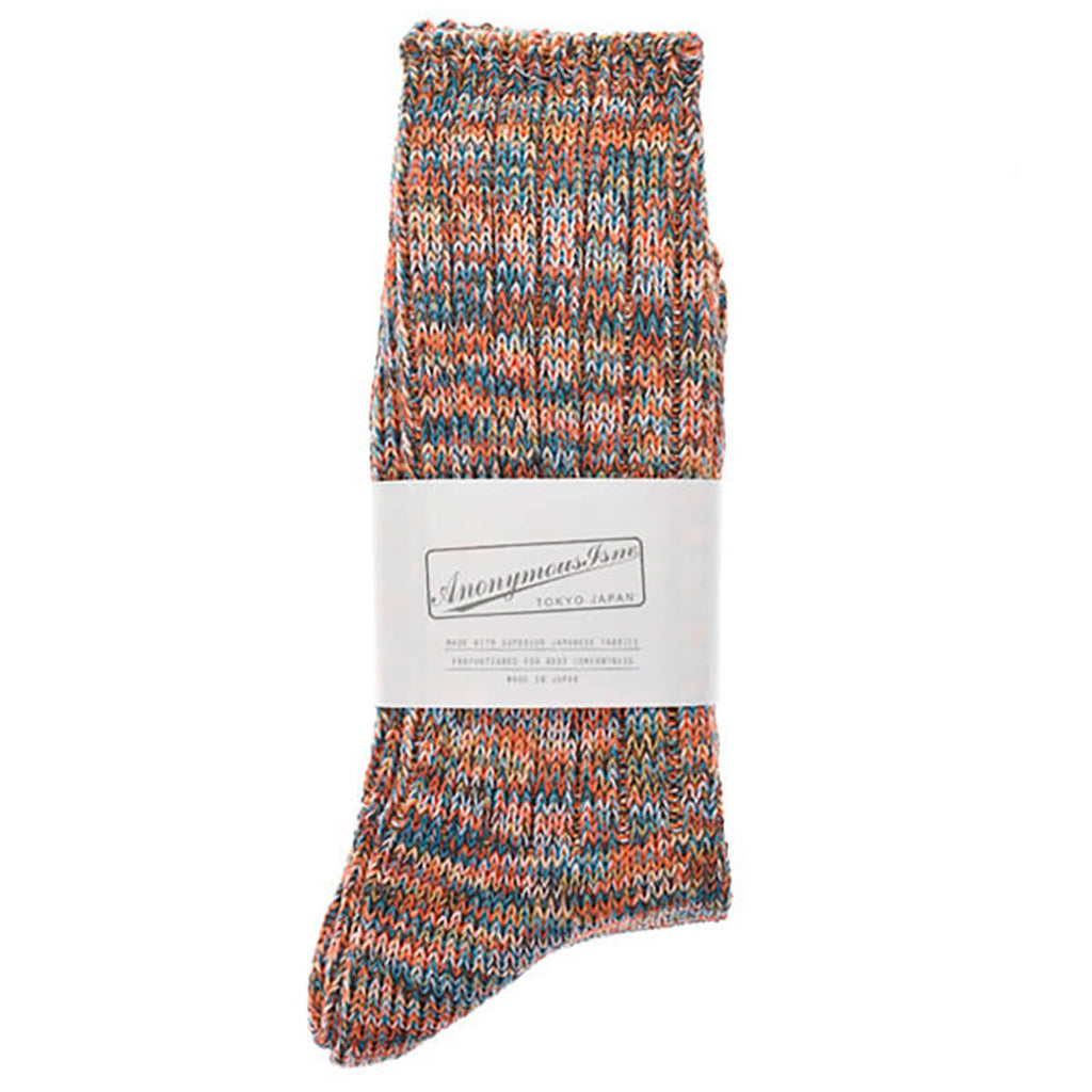 5 Colour Mix Crew Adult Socks by Anonymous Ism. The 5 colour mix crew is a medium-weight, chunky knit sock with a bouncy feel to the yarn and a supremely comfortable ribbed top. This is a signature piece from Anonymous Ism, blending craftsmanship with quality. The knitted fabric is carefully crafted using a unique over-gauge technique on low-gauge machines, achieving a perfect balance of softness, thickness, and durability. Made with vibrant, high-quality combed yarn, the socks reveal a rich, colourful pattern as the five hues intertwine beautifully, creating a distinctive and dynamic look.