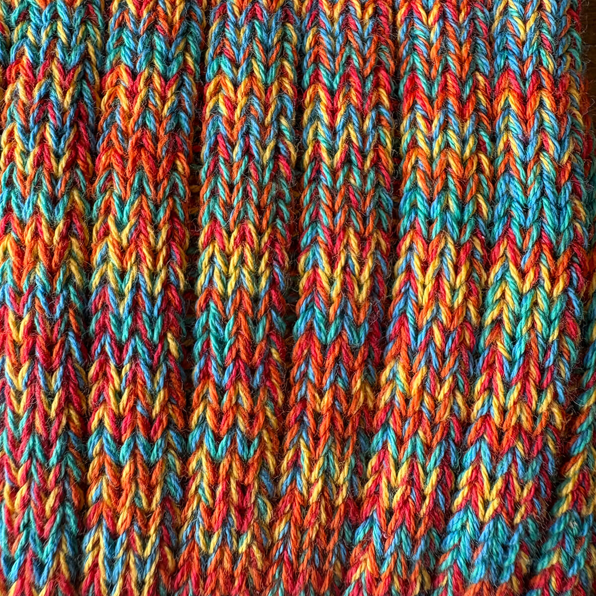 5 Colour Mix Crew Adult Socks by Anonymous Ism. The 5 colour mix crew is a medium-weight, chunky knit sock with a bouncy feel to the yarn and a supremely comfortable ribbed top. This is a signature piece from Anonymous Ism, blending craftsmanship with quality. The knitted fabric is carefully crafted using a unique over-gauge technique on low-gauge machines, achieving a perfect balance of softness, thickness, and durability. Made with vibrant, high-quality combed yarn, the socks reveal a rich, colourful pattern as the five hues intertwine beautifully, creating a distinctive and dynamic look.