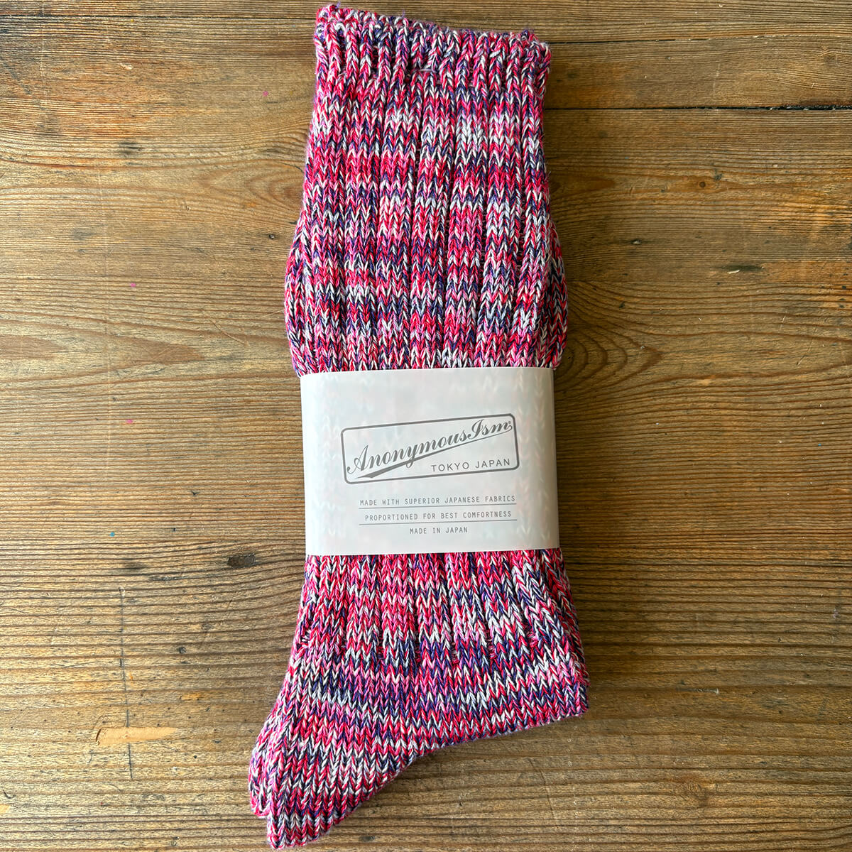 5 Colour Mix Crew Adult Socks by Anonymous Ism. The 5 colour mix crew is a medium-weight, chunky knit sock with a bouncy feel to the yarn and a supremely comfortable ribbed top. This is a signature piece from Anonymous Ism, blending craftsmanship with quality. The knitted fabric is carefully crafted using a unique over-gauge technique on low-gauge machines, achieving a perfect balance of softness, thickness, and durability. Made with vibrant, high-quality combed yarn, the socks reveal a rich, colourful pattern as the five hues intertwine beautifully, creating a distinctive and dynamic look.