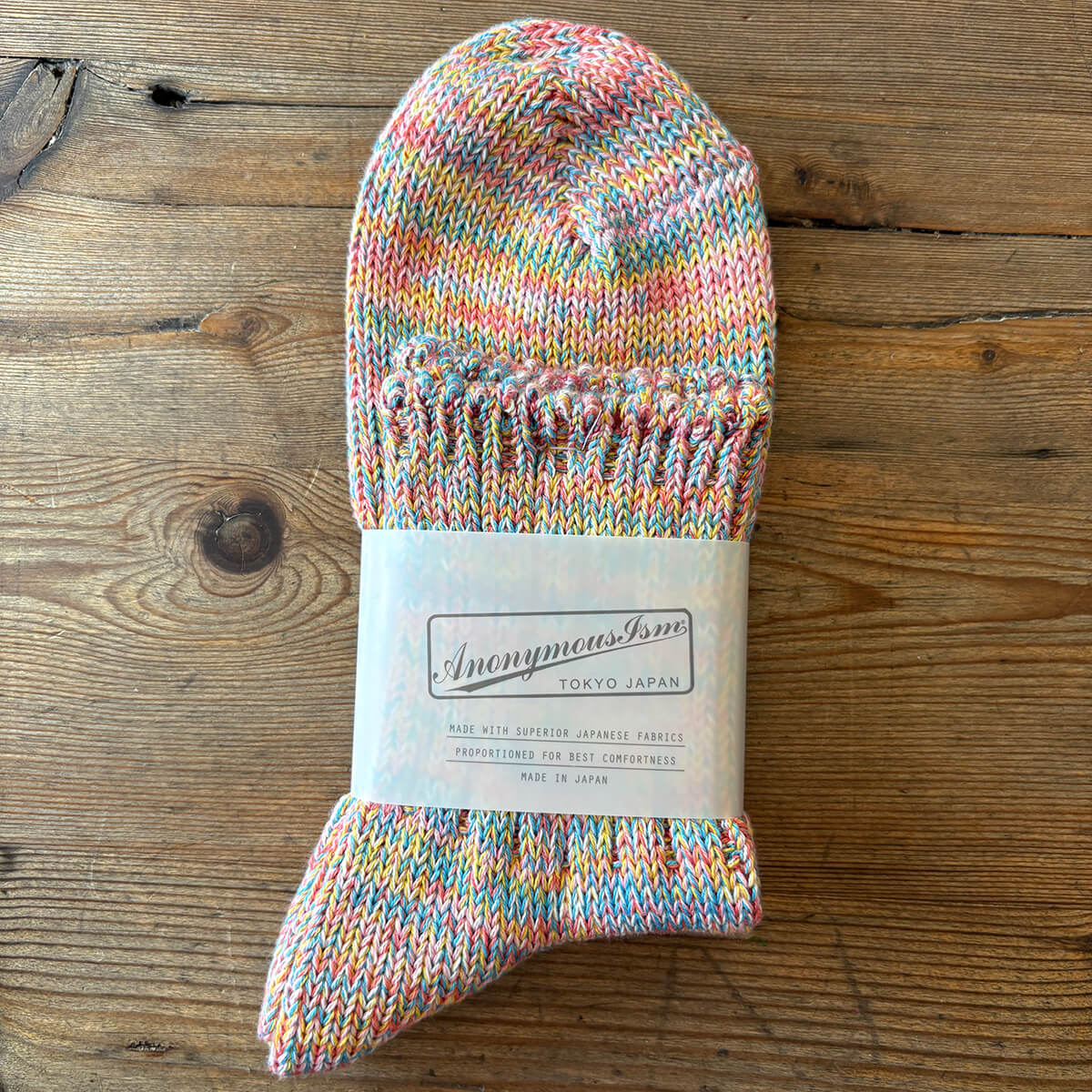 5 Colour Mix Quarter Adult Socks by Anonymous Ism. The 5 colour mix quarter sock is a medium-weight, chunky knit sock with a bouncy feel to the yarn and a supremely comfortable ribbed top. This is a signature piece from Anonymous Ism, blending craftsmanship with quality. The knitted fabric is carefully crafted using a unique over-gauge technique on low-gauge machines, achieving a perfect balance of softness, thickness, and durability. Made with vibrant, high-quality combed yarn, the socks reveal a rich, colourful pattern as the five hues intertwine beautifully, creating a distinctive and dynamic look. The quarter length sock is longer than an ankle sock but shorter than crew socks, typically extending above the ankle bone. This length makes them ideal for casual wear and warmer weather, providing the right amount of coverage without being too restrictive.