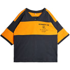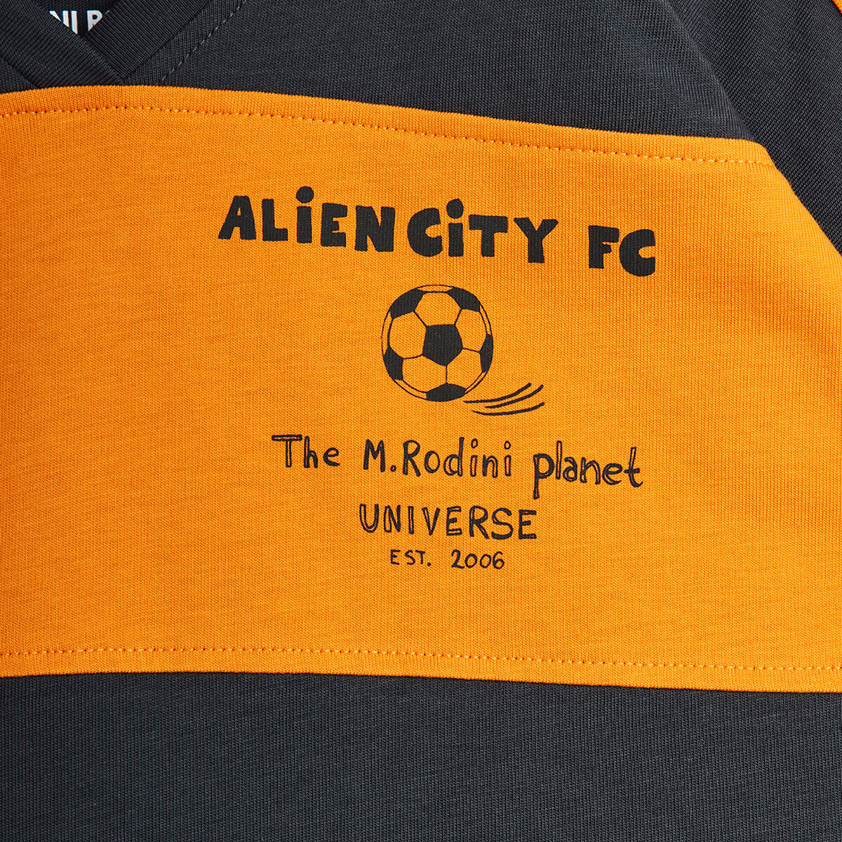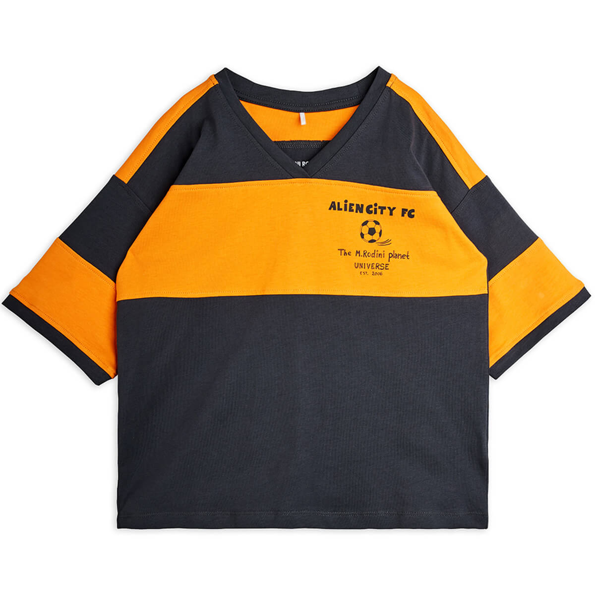 Alien City FC loose fit tee by Mini Rodini. Loose short sleeved fit T-shirt with a V-neck and ribbed neckline. Panelled stripe design front and back and an Alien City FC chest print with football motif.