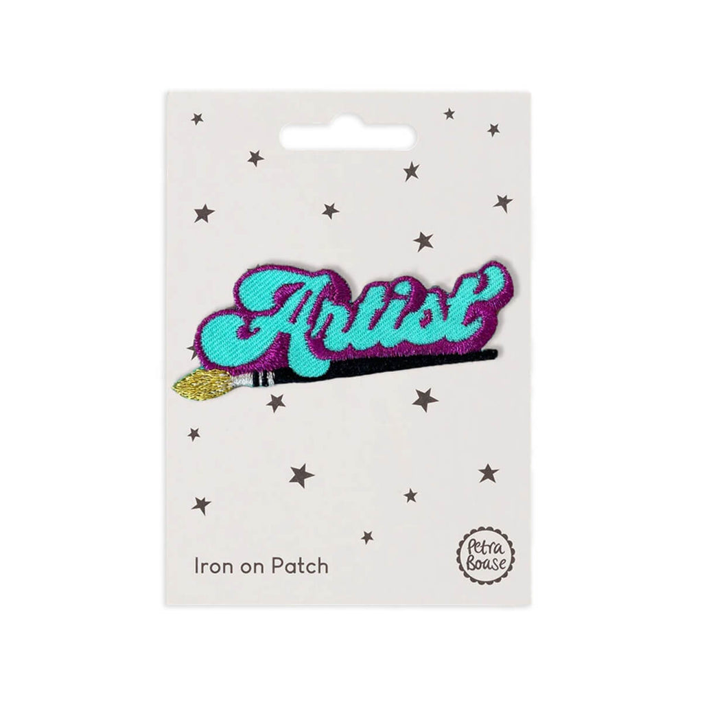 Artist iron on patch by Petra Boase. Richly embroidered word "Artist" patch, with an iron-on backing so can be removed from the card and ironed on to a favourite t-shirt, rucksack or whatever you like! The patch is a stylish blue, with purple, black and gold embroidered detailing.