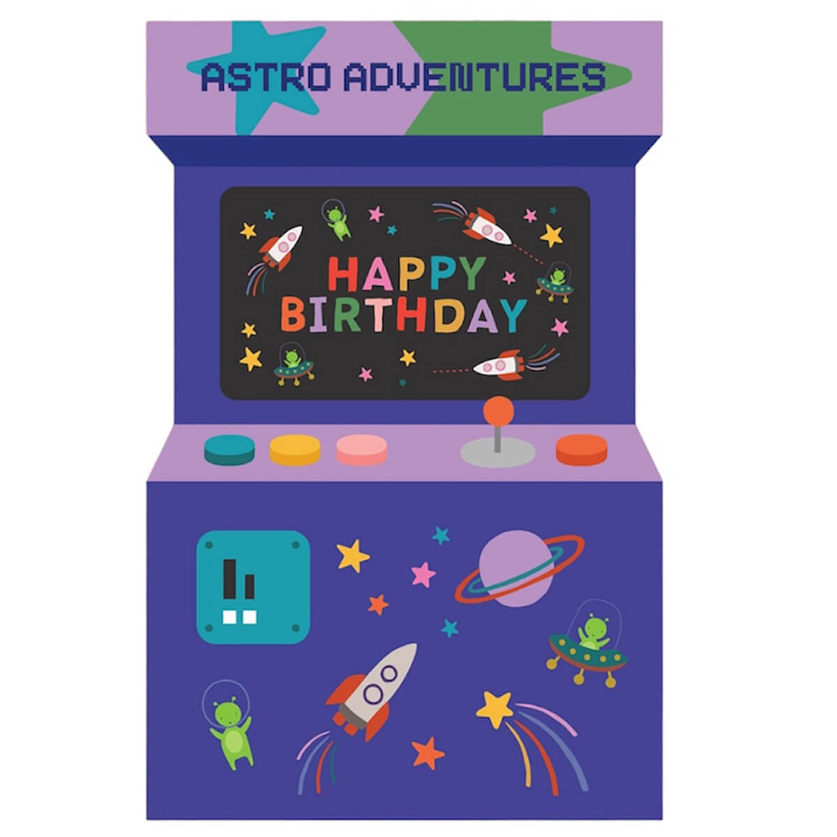 Astro Adventures Greetings Card by Mifkins. Embark on a journey of fun and nostalgia with our exciting "Astro Adventures" Arcade Game-Shaped Birthday Card. This unique greeting card, designed to resemble a classic arcade game machine, captures the thrill of space exploration with its vibrant colors and intricate details. Perfect for gamers and space enthusiasts alike, it's sure to spark joy and excitement for anyone celebrating their special day. Crafted from high-quality, FSC Certified card, it's a thoughtful and fun choice for spreading birthday cheerMade in the UK.