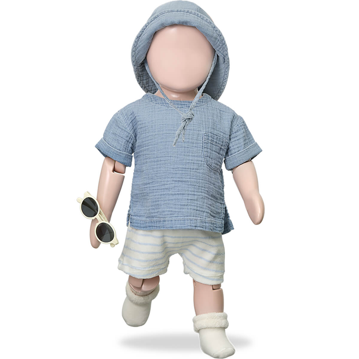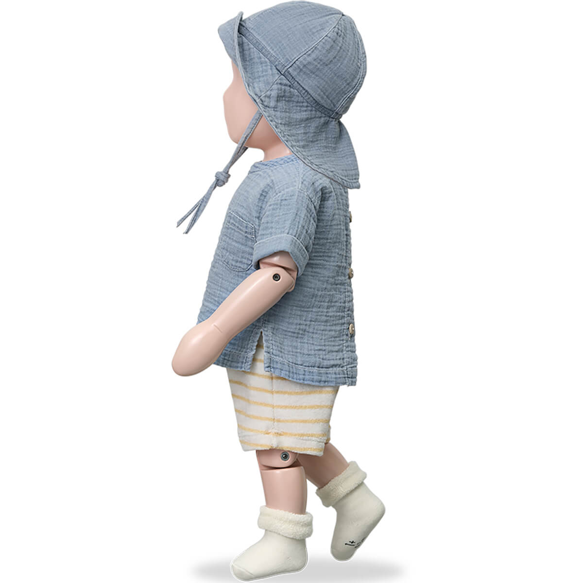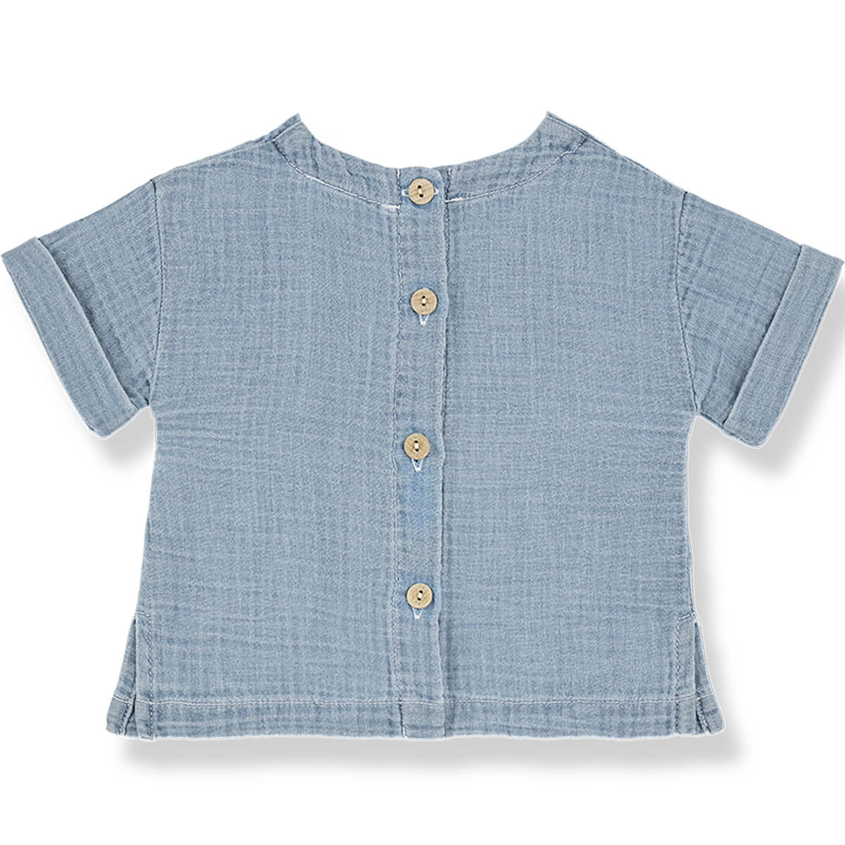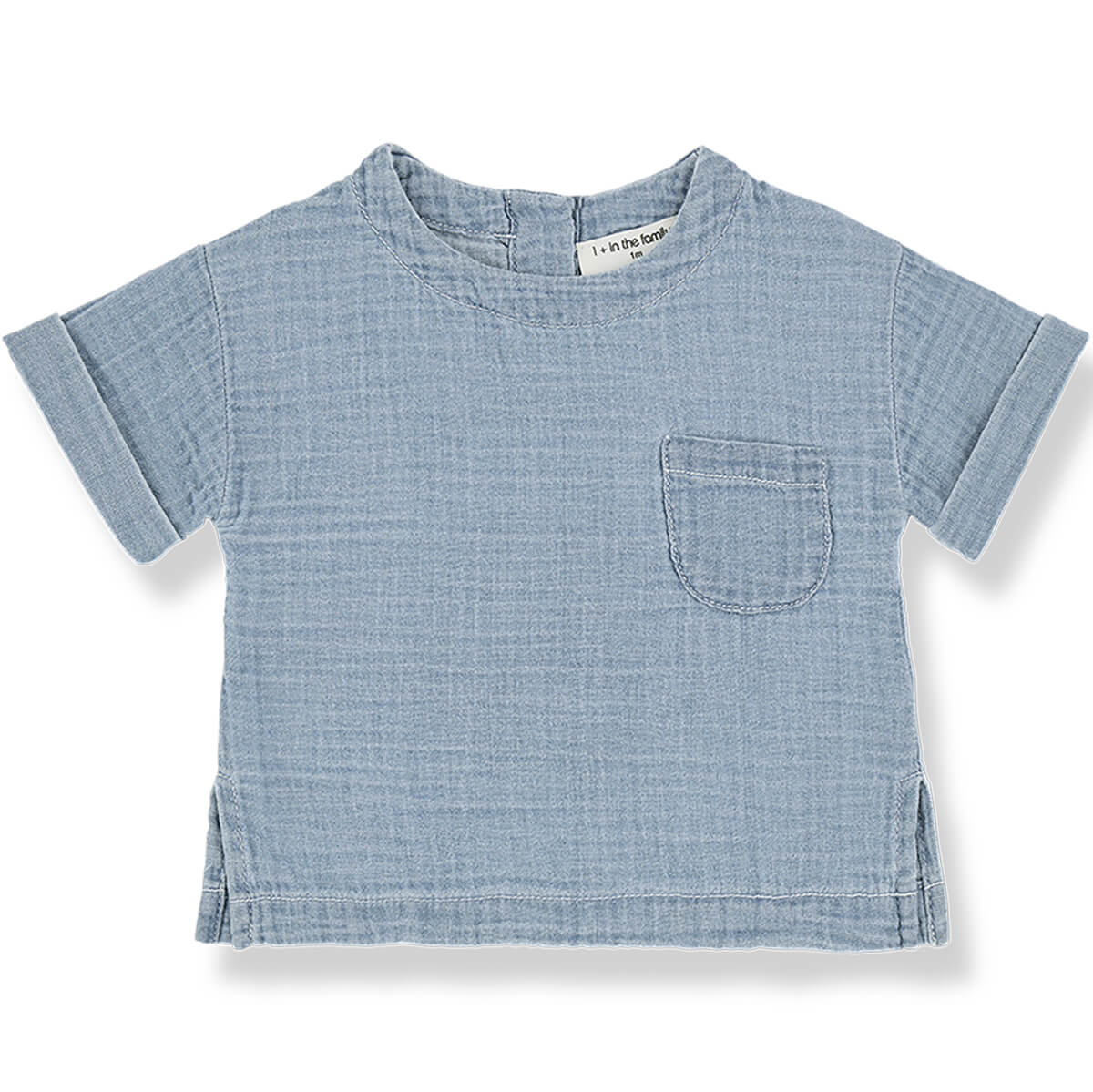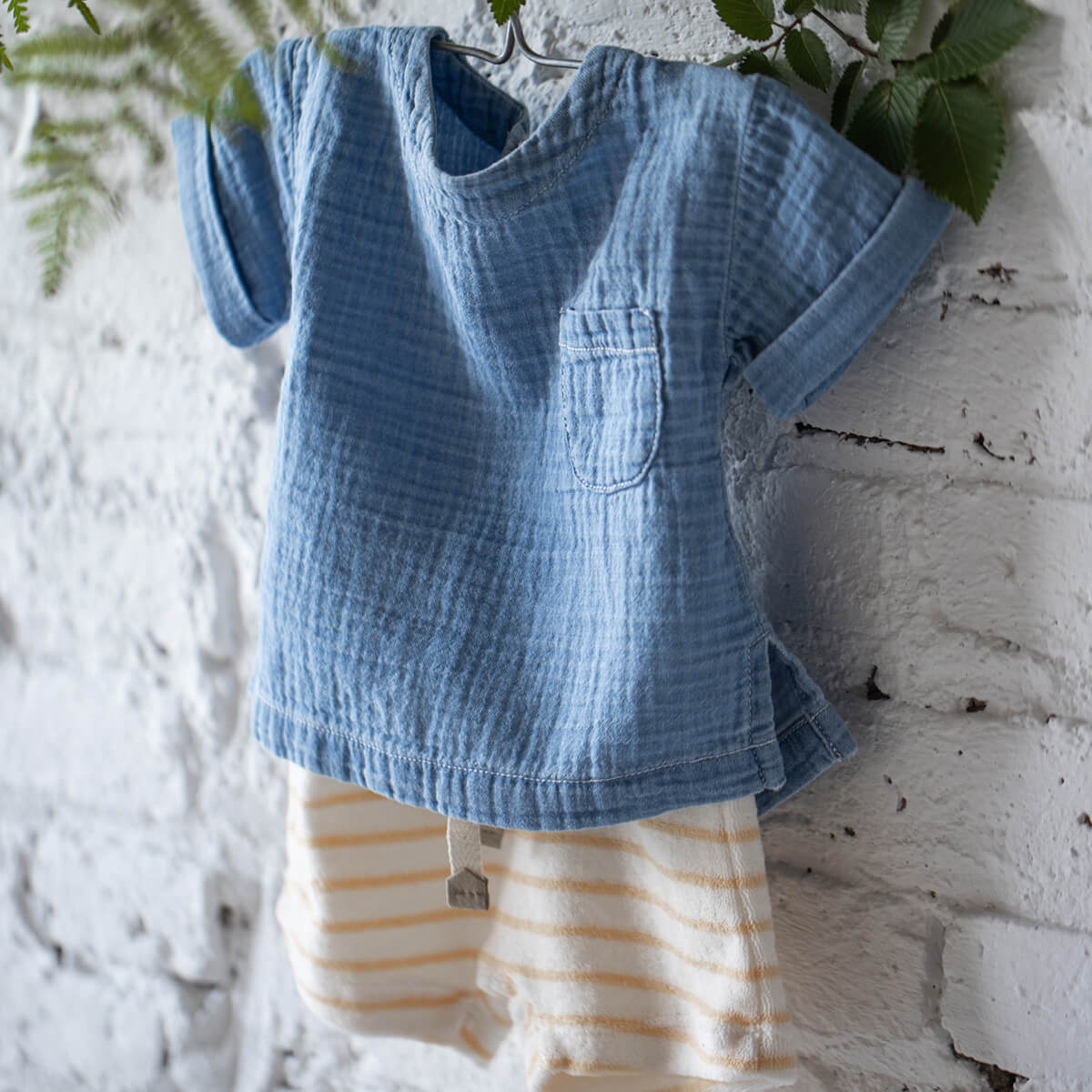 Benedetto Top by 1+ in the Family. Short-sleeve pocket t-shirt in a super soft washed muslin fabric with wooden buttons.