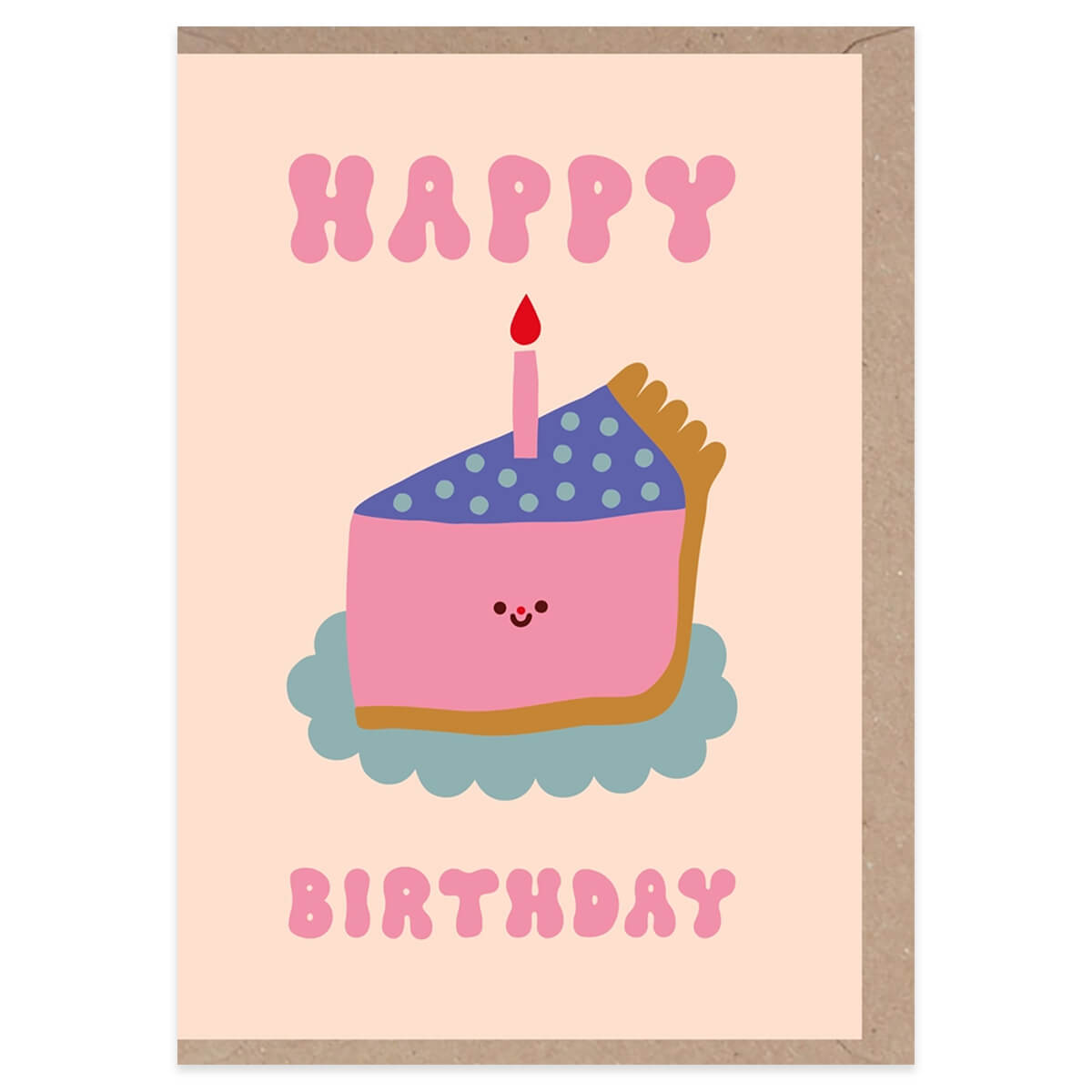 Birthday Cake Birthday Greetings Card by Rumble Cards. Make someone’s birthday a little sweeter with this 'Happy Birthday' greeting card, beautifully crafted in collaboration between Rumble Cards and Wera Krason. This card showcases a slice of cute birthday cake, complete with a smile and a single burning candle, set against a soft pink background.