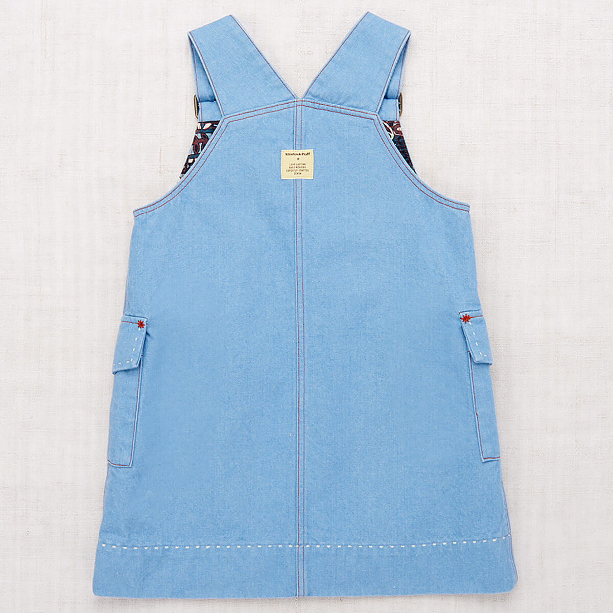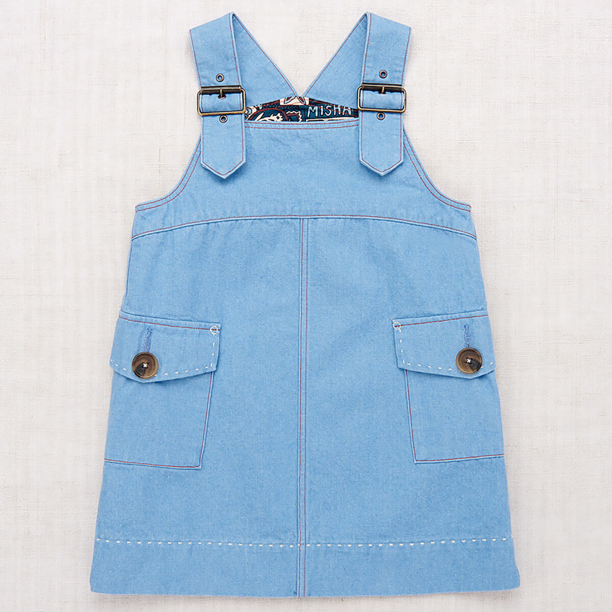Buckle Jumper Dress by Misha & Puff. From Misha & Puff's denim collection — a vintage-inspired jumper dress in 100% cotton denim, with adjustable buckle straps, two patch pockets with horn button closure, a contrast print lined bib, and contrast topstitch detail. Finished with hand-tacked stitches instead of rivets for softness.