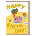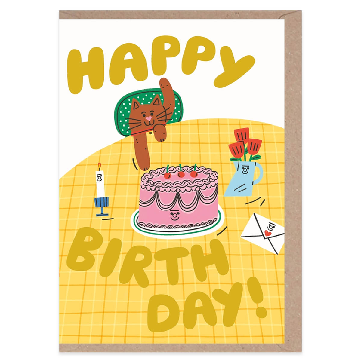 Cat Lover Birthday Greetings Card by Rumble Cards. For any cat lover on their birthday, this playful birthday card by illustrator Tess Smith Roberts features dining room table with a, smiley pink cake, dancing candle, vase of tulips and birthday card. With bold foil lettering that reads "Happy Birthday", it's a fun and unique way to send celebratory wishes. Perfect for cat lovers, cake fans, and anyone who enjoys vibrant illustration with character. Great for kids and adults alike, this feel-good card adds energy to any special day.