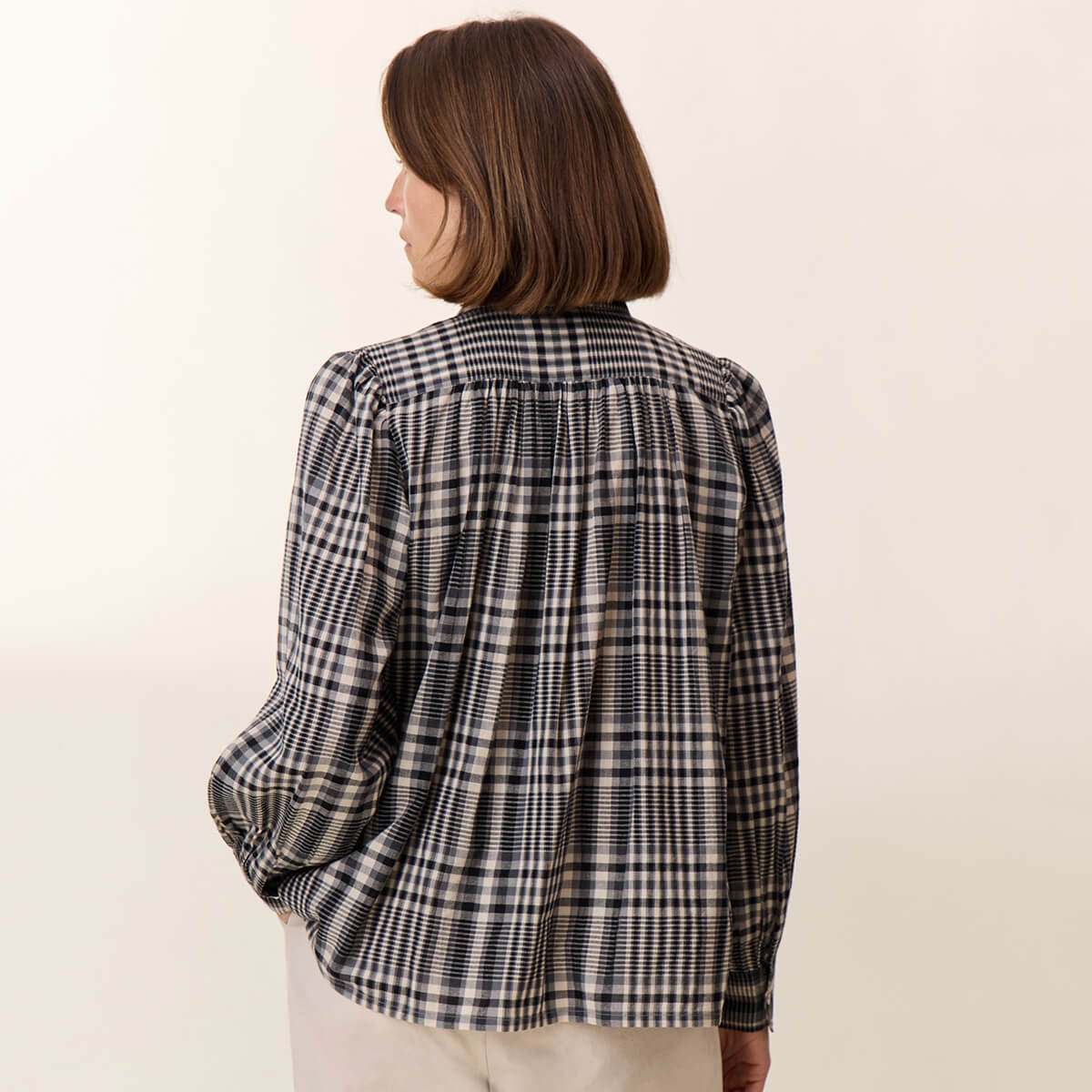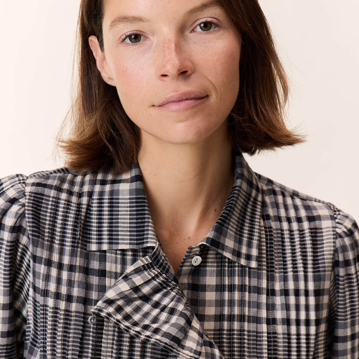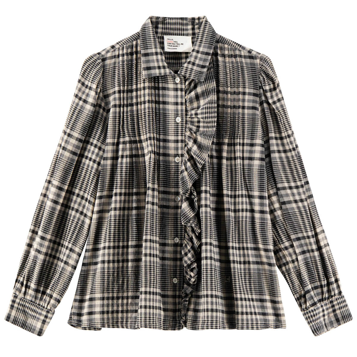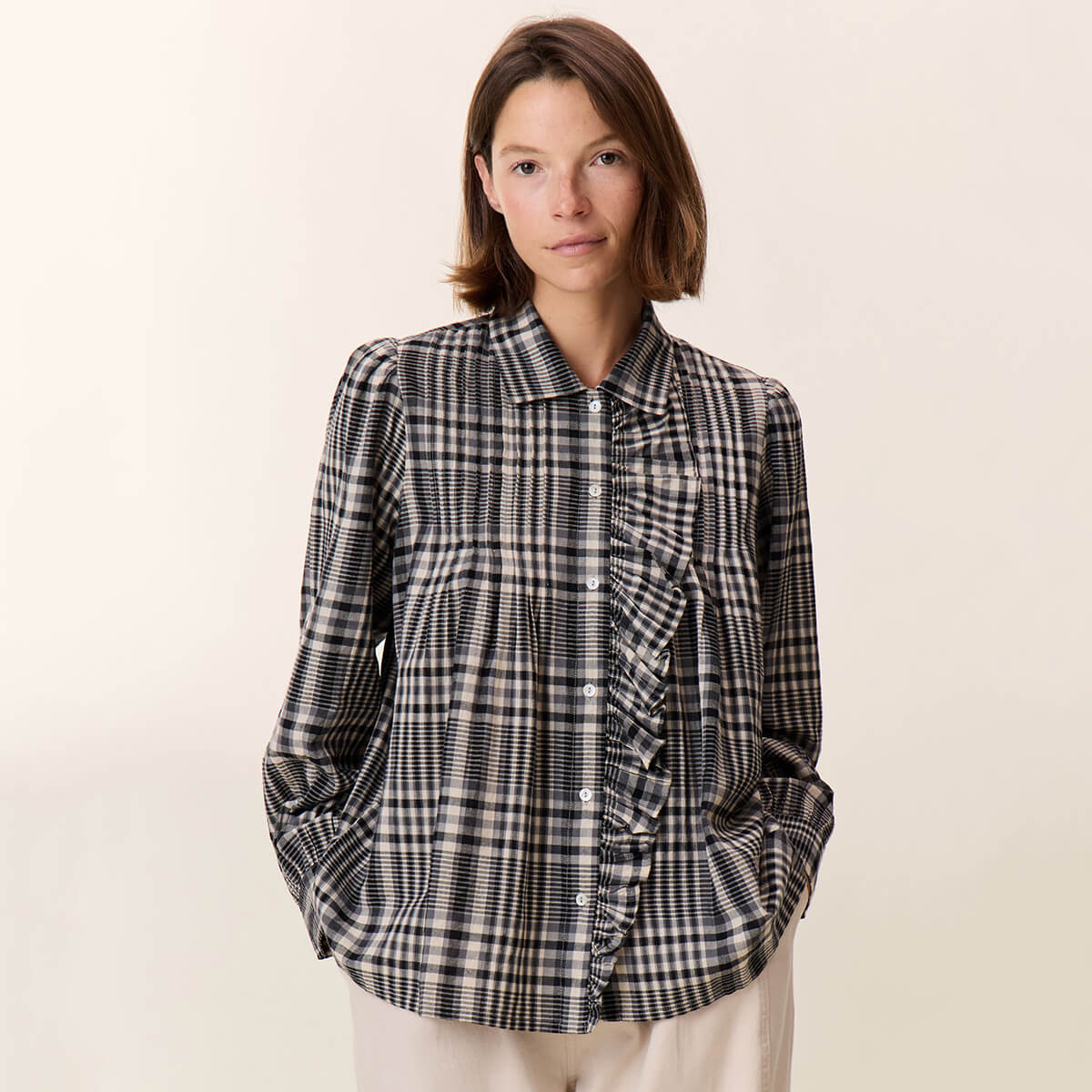 Claus Shirt by Leon & Harper. This shirt features a loose fit highlighted by a classic check pattern. A vertical ruffle on the front and gathers at the shoulders add rhythm to the silhouette, while the long sleeves end with buttoned cuffs for a clean visual finish. The overall look combines a cool vibe with a structured style, perfect for mixing casualness with a confident appearance.