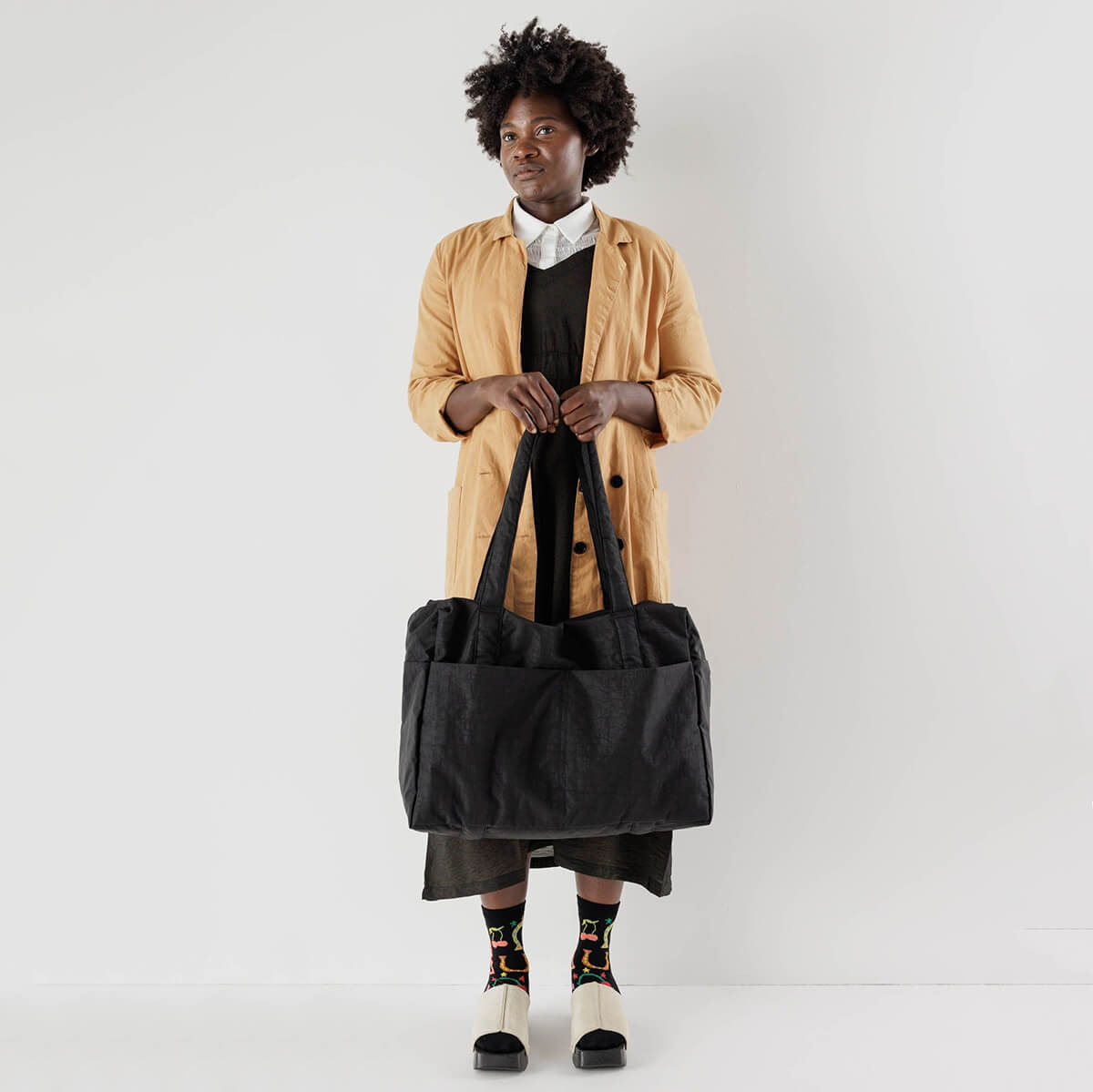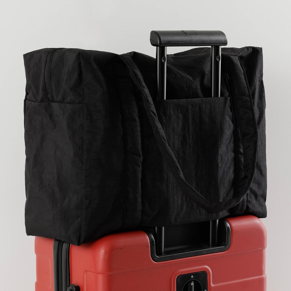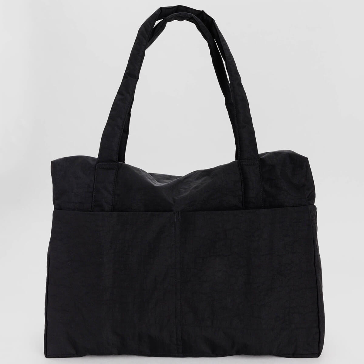 Cloud carry-on Bag by Baggu.  The Cloud Carry-On is the bag to help you float away for a weekend… and maybe then some. It fits everything you need for a weekend away, happily rides on your roll-aboard, stuffs easily into an overhead bin. Take it on a trip, or let it take you on one. Top zip closure. Trolley sleeve. Two large exterior pockets and a detachable interior zip pouch.