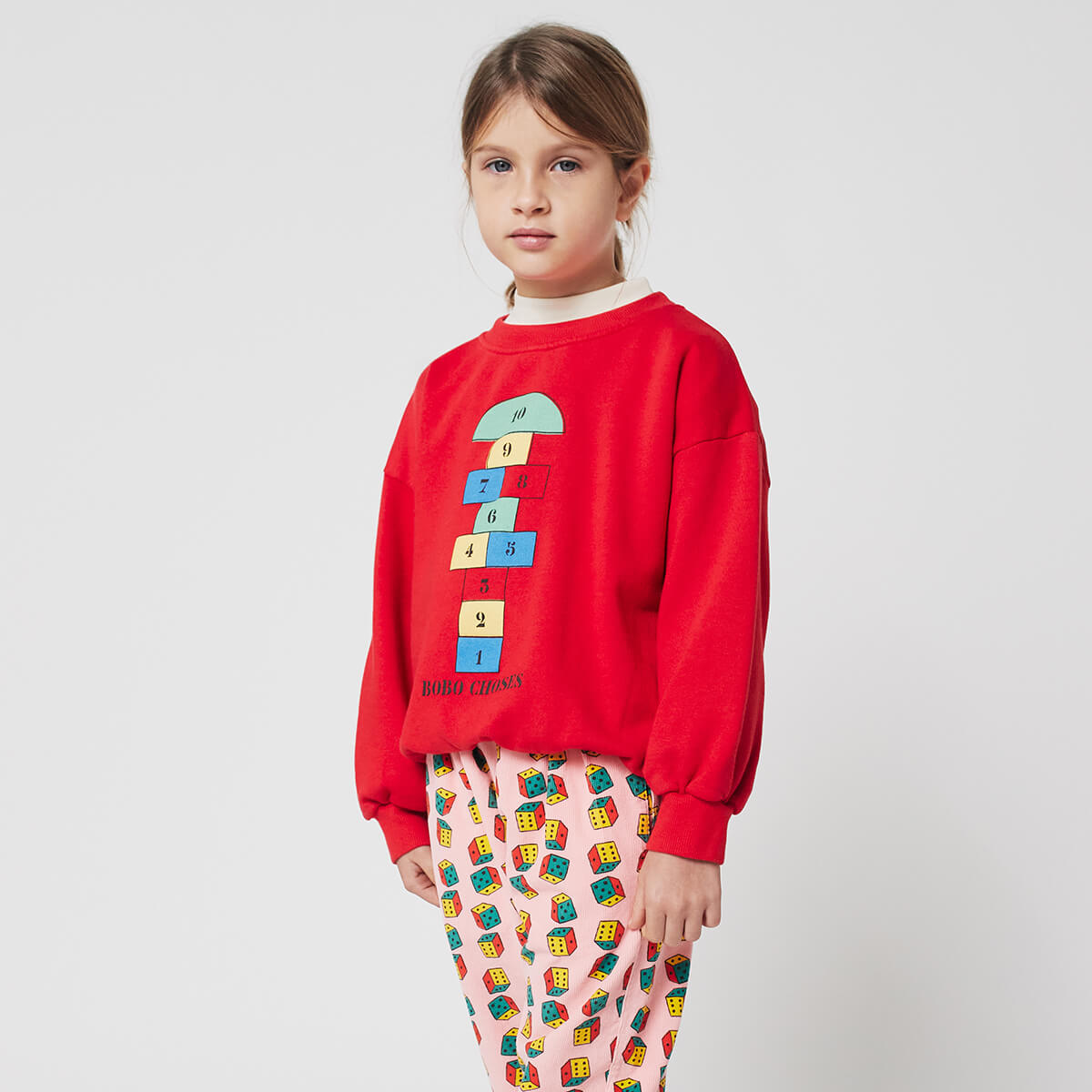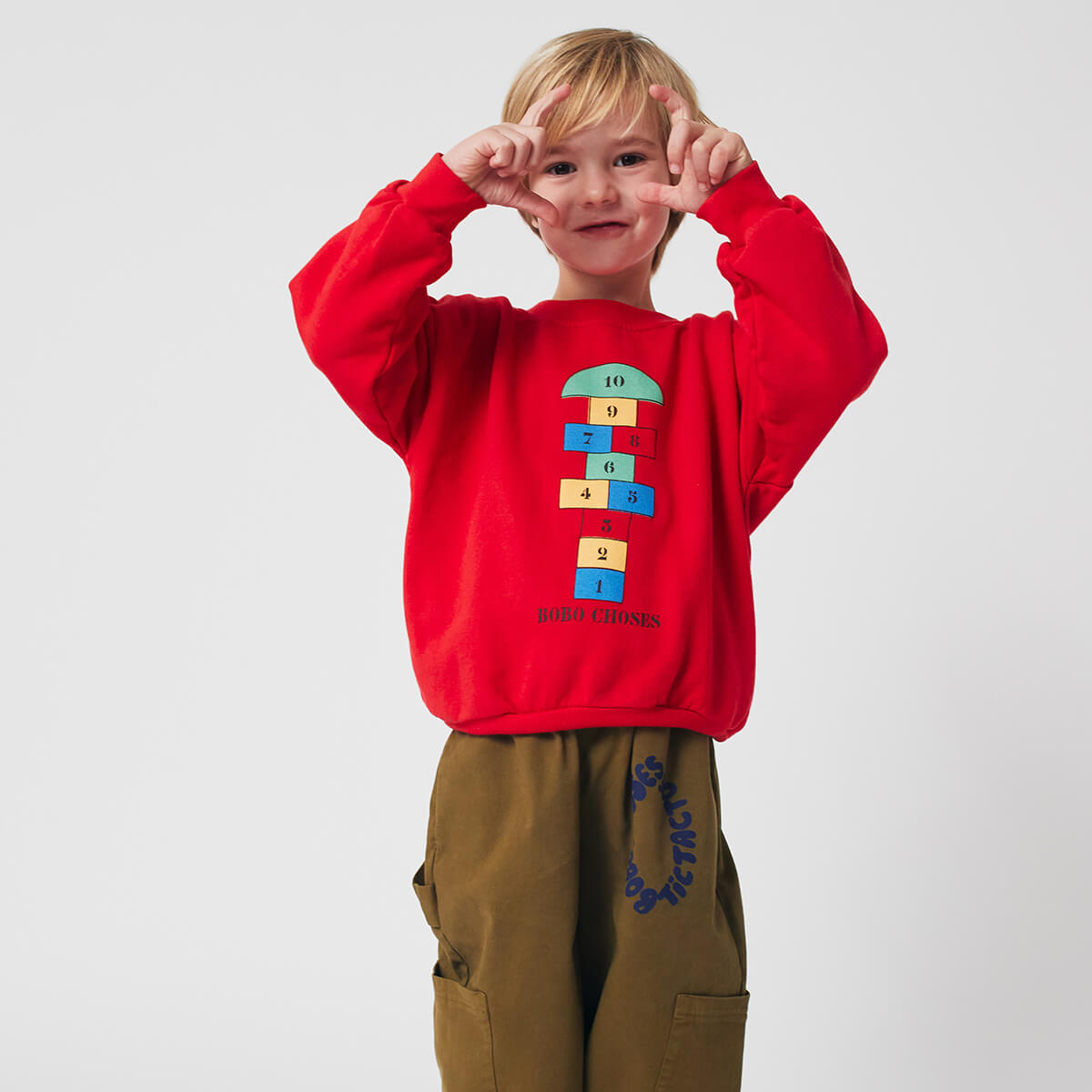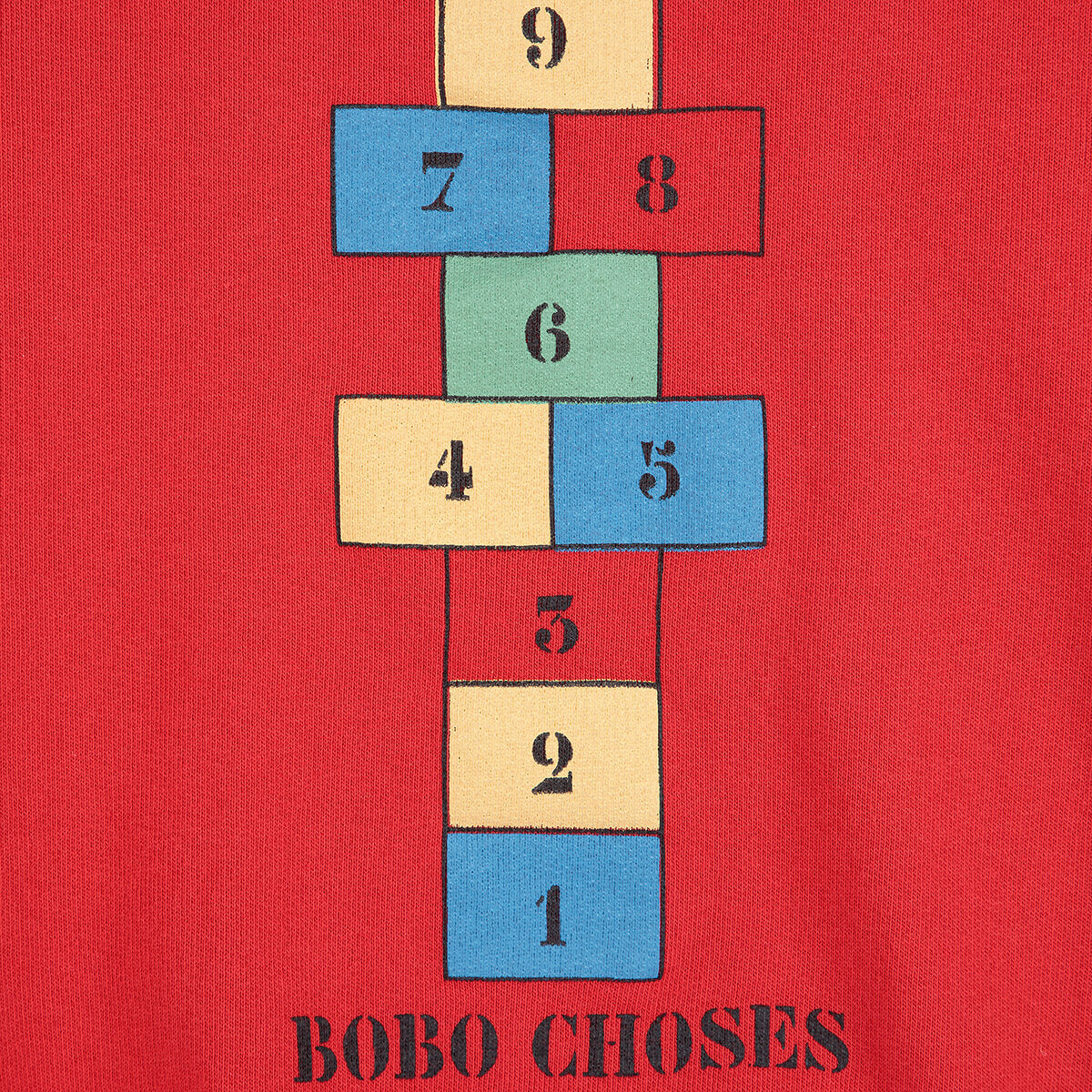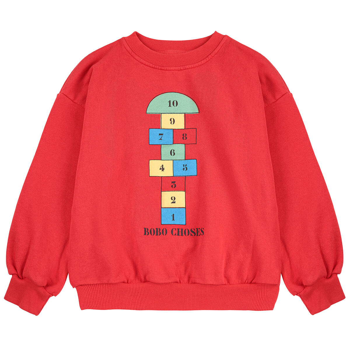 Hopscotch Sweatshirt by Bobo Choses. Cosy and fun, this sweatshirt is a versatile essential for casual comfort. Featuring 100% organic cotton, ribbed cuffs, and a loose fit, this red sweatshirt is designed to bring comfort to everyday.