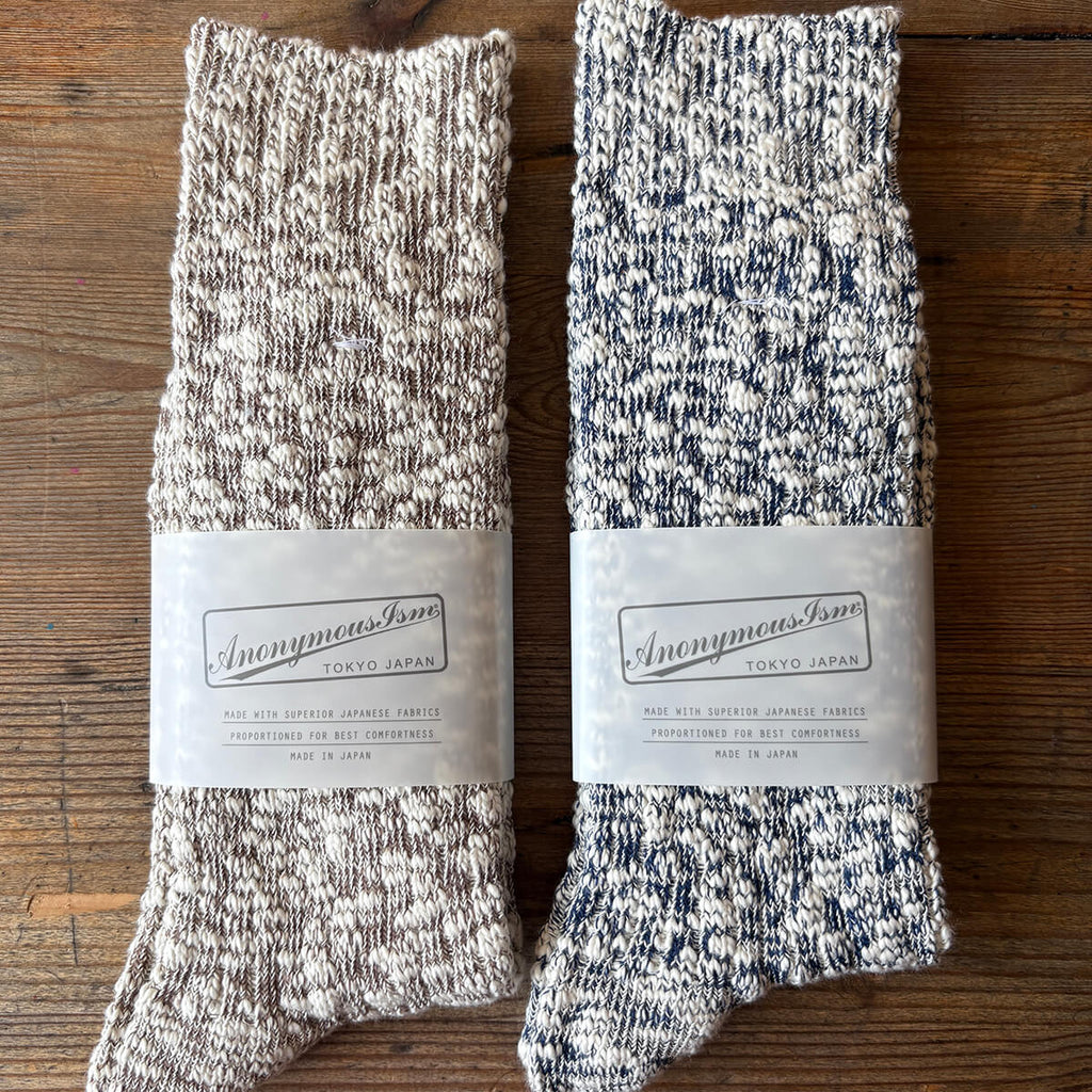 Anonymous Ism was founded in 2002 in Tokyo, Japan, making its first sock collections on 1970s traditional knitting machines which were slow and unreliable, but able to create intricate designs and textures of exceptional quality which was not possible in commercial manufacturing. The machines were rare, with spare parts very hard to find, so Anomymous Ism developed modern alternatives in sock production that could replicate the feel of the old looms and reproduce the traditional Japanese textile techniques without having to worry about machinery parts falling off. The brand continues to manufacture in Japan using sustainable techniques and thoughtful packaging. Its rider (the wrap around the socks) was developed with the Japanese government, it’s made from Limex (limestone) and will one day go back to being limestone. Anonymous Ism designs reference not only traditional sock-making but also diverse modern sources - marine, military and workwear, to name a few. Historical Japanese designs, incorporating art, traditional clothing and the ancient military disciplines also contribute to a huge variety of influences and inspirations. The brand has become synonymous with understated anonymous style and timeless design, and many of their designs have now become iconic, modern classics.