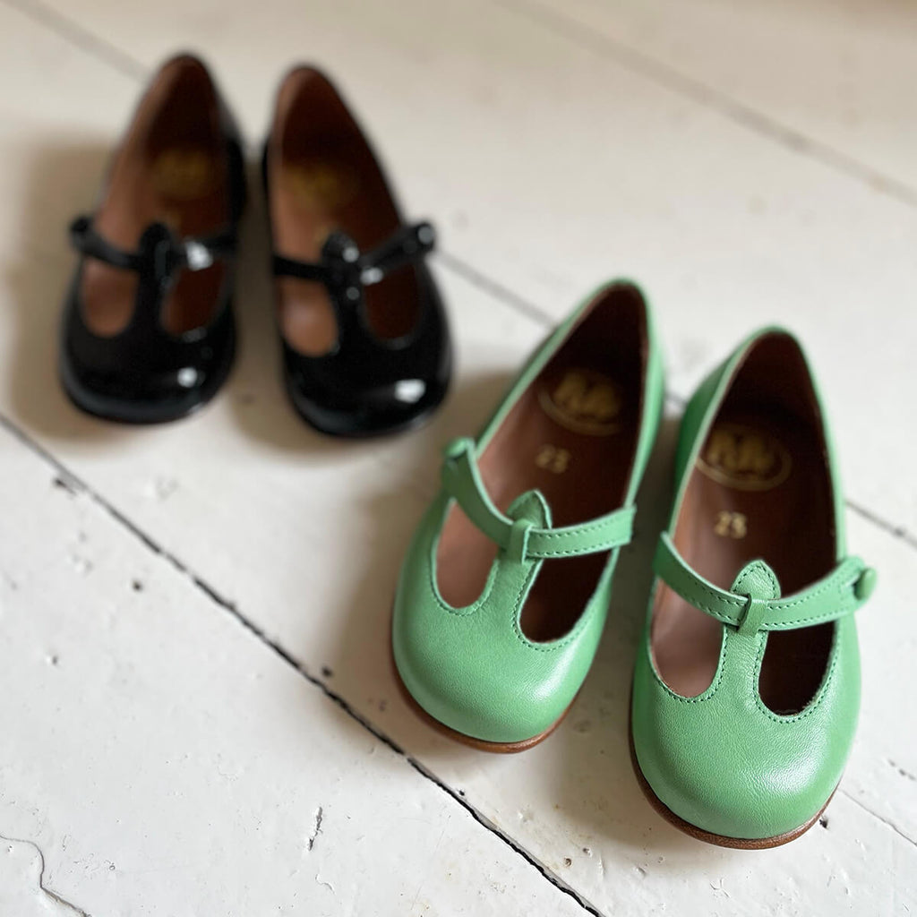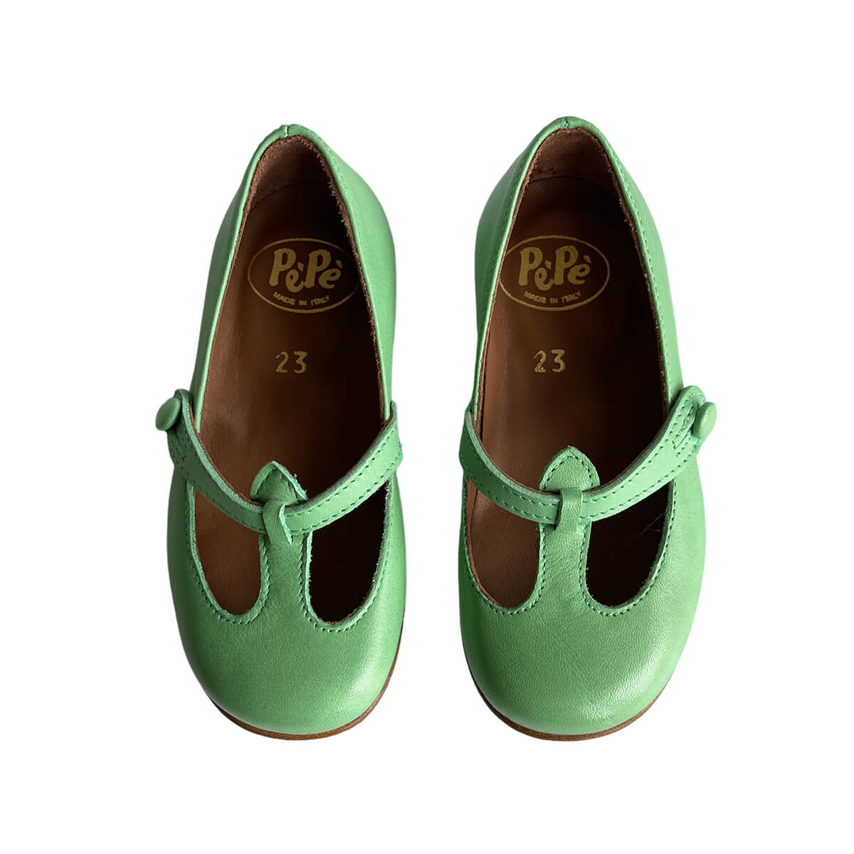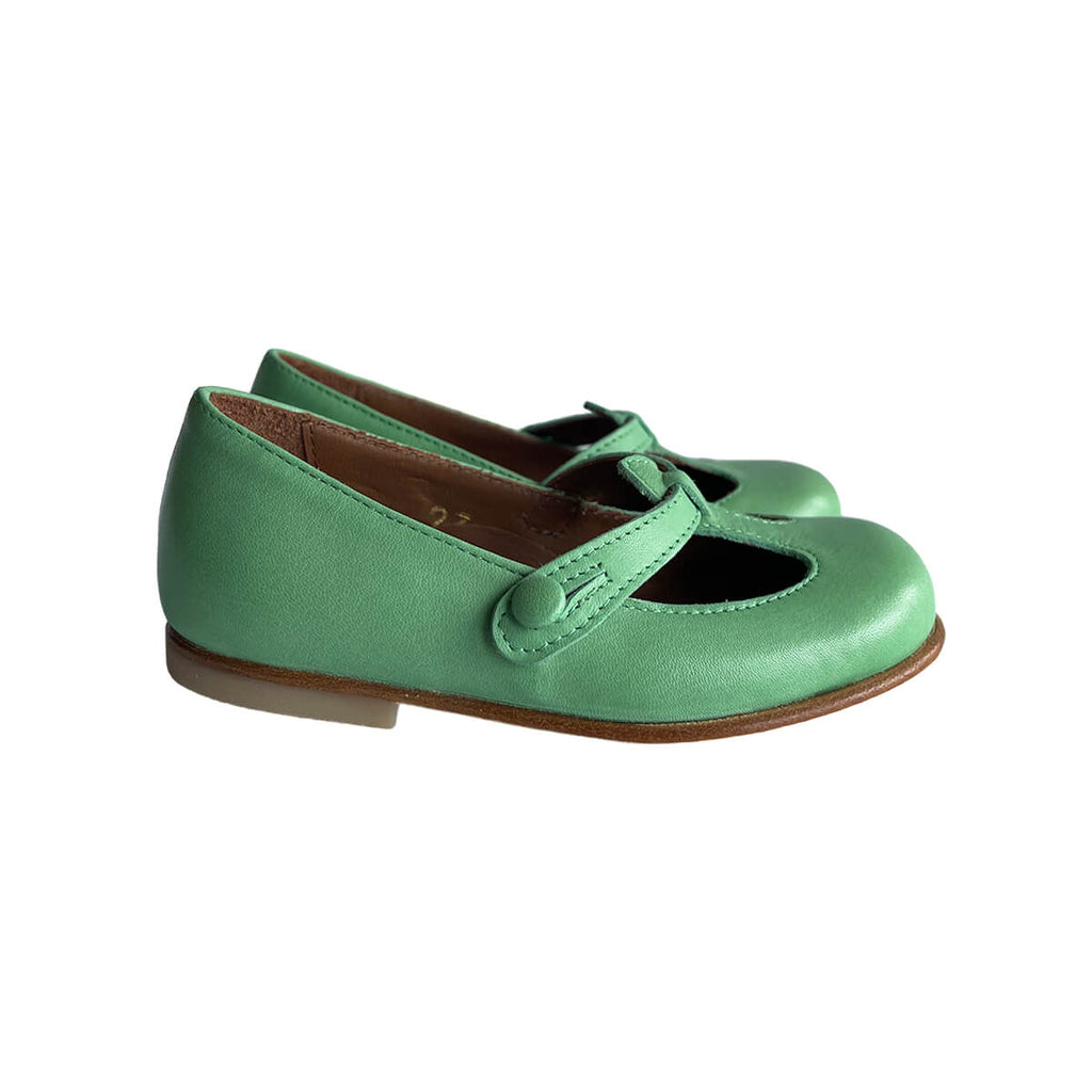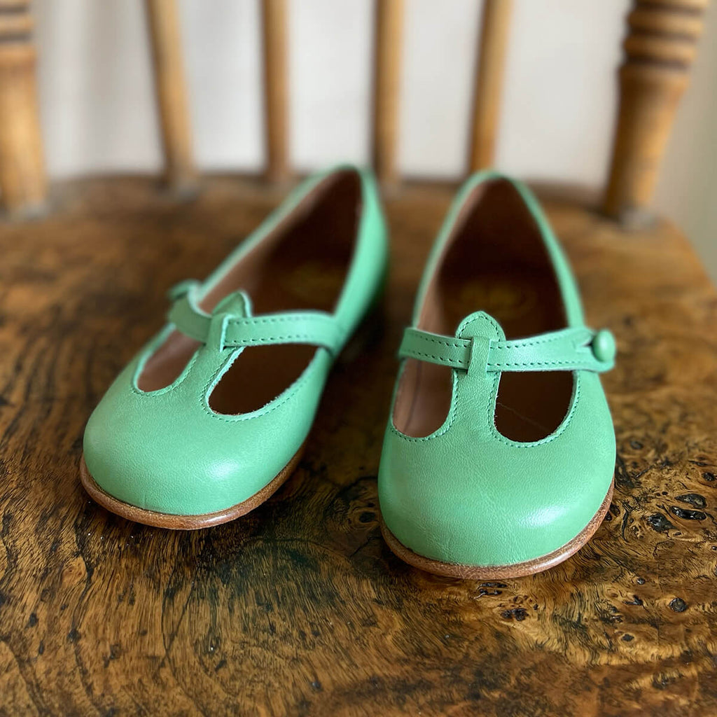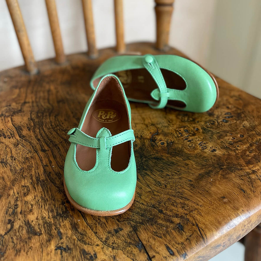 Lulu T bar by PèPè shoes.  Button T bar shoes in vegetally tanned mint green leather with low T bar detail.  Soft and flexible leather sole.  Lined with 100% leather.  Handmade using traditional methods in Italy.