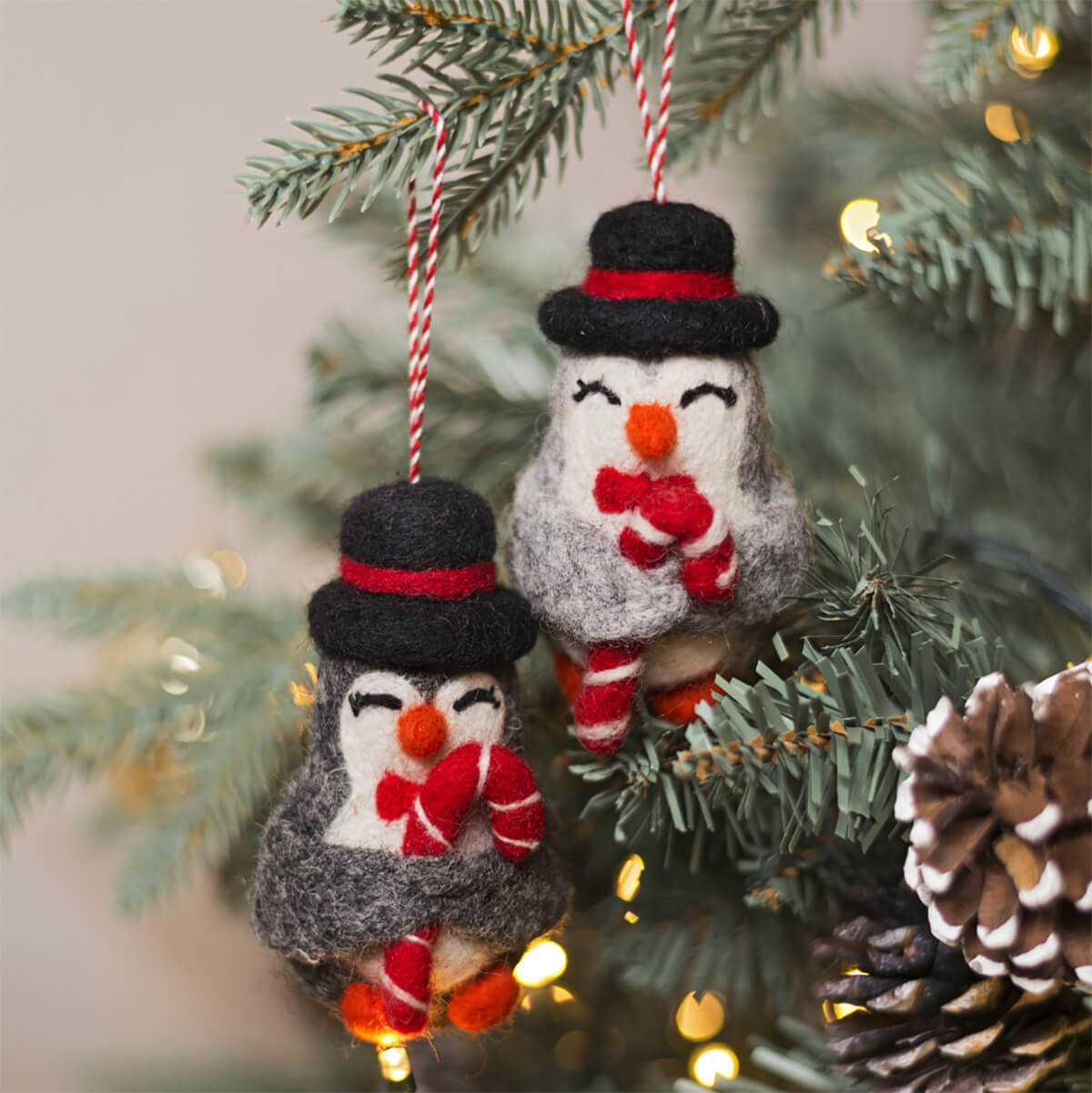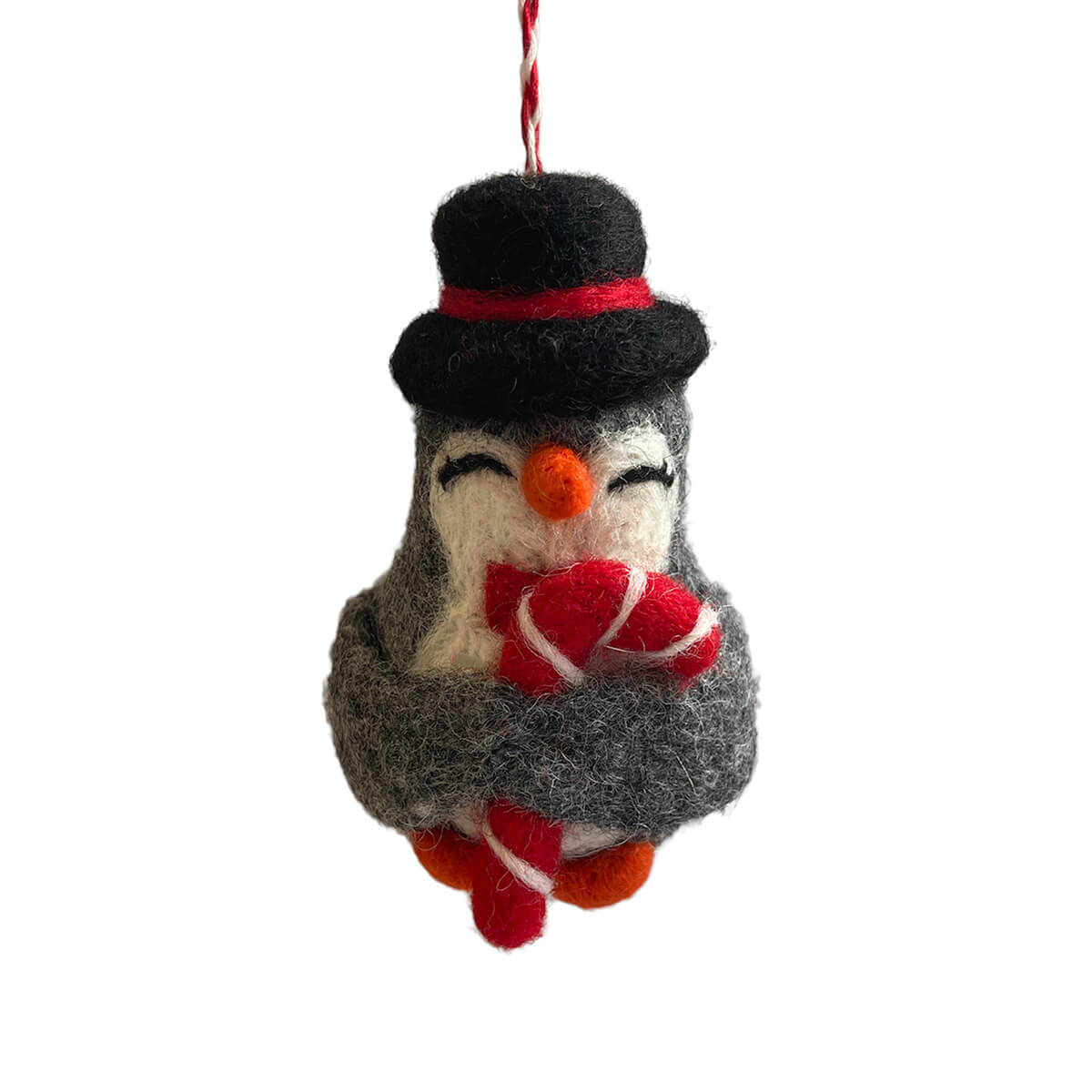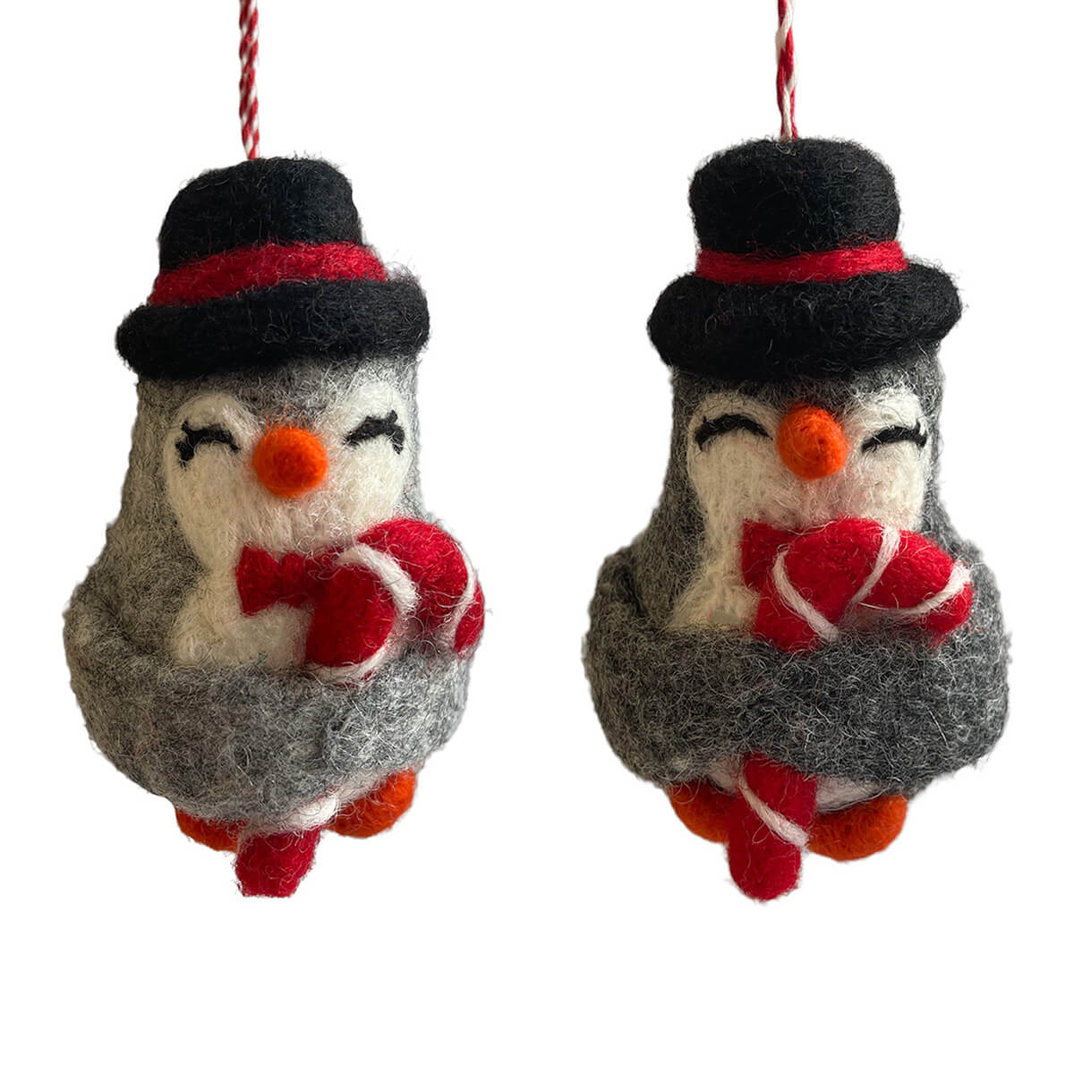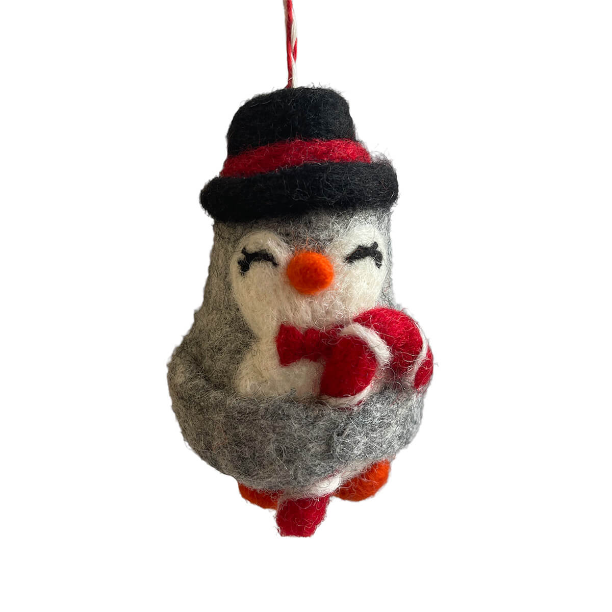 Penguin with candy cane hanging Christmas decoration by Amica. This super cute penguin is wearing a natty black bowler hat and red bow-tie and clutches a hand-felted candy cane. Handmade from 100% wool felt, Fair trade and plastic free from Nepal.