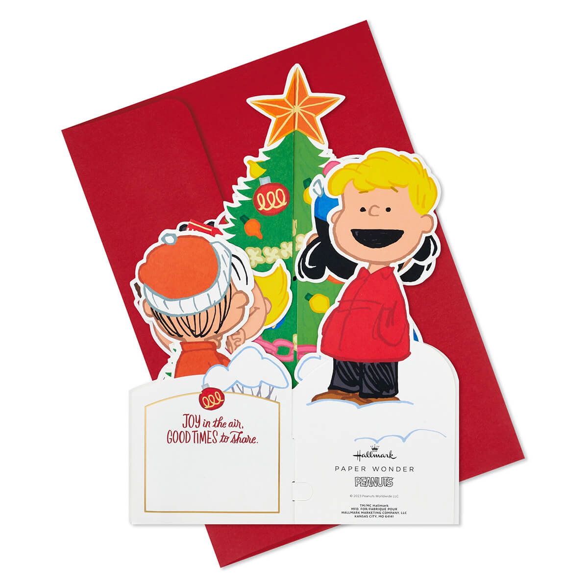 Pop-Up Peanuts Children and Snoopy Christmas Greetings Card by Hallmark. Send them a Christmas card they'll adore year after year with this exciting PEANUTS™ Comics 3D and pop up card. Celebrate the festivities with laughter with their favourite characters Charlie Brown and SNOOPY.