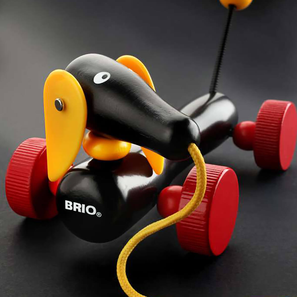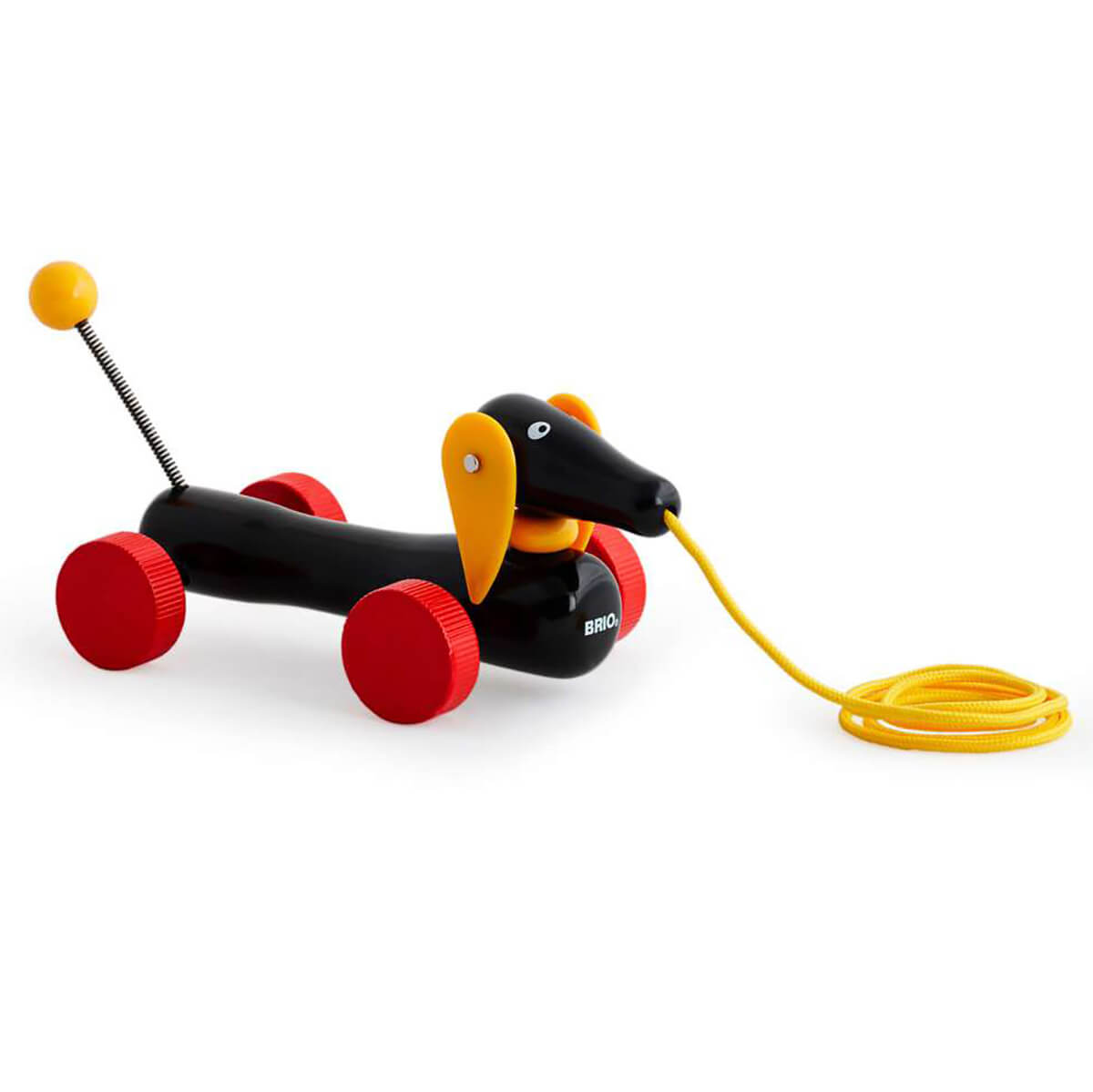 Pull Along dachshund by Brio. The Dachshund has been a Brio classic since 1953. When the toddler takes the wooden pull-along dog for a walk, it moves its head and ears and wags its tail just like a real dog. This is a retro toy in its original design. Perfect for babies and toddlers learning to walk.