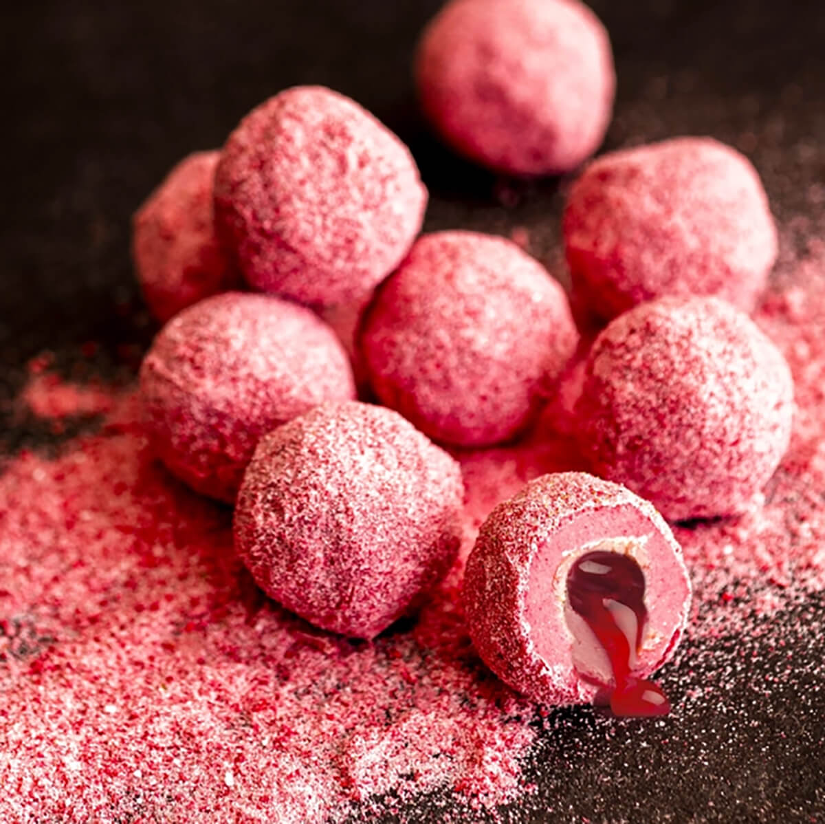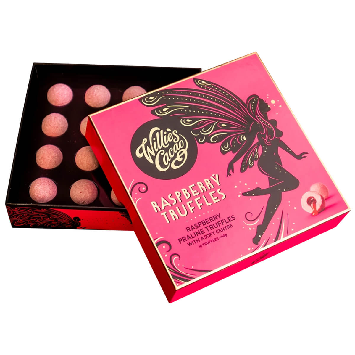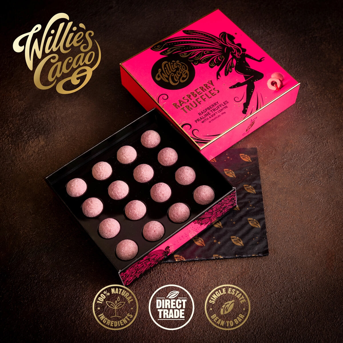 Raspberry Truffles by Willie's Cacao. The taste of pure happiness. This smooth, creamy truffle is bursting with raspberries, and at its heart lies a joyous soft raspberry centre.