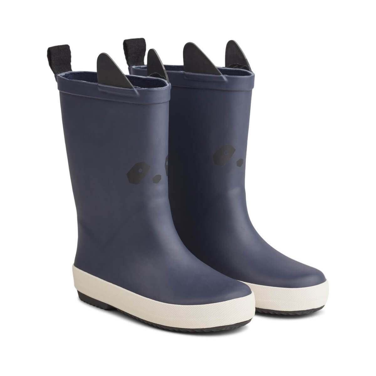 Rio rainboots by Liewood. Rubber wellington boots in navy with panda ears and face. Pull on-off wellies with a handy back tab.