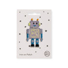 Robot iron on patch by Petra Boase. Richly embroidered colourful patch, with an iron-on backing so can be removed from the card and ironed on to a favourite t-shirt, rucksack or whatever you like! The patch is grey, with multi coloured embroidered detailing.