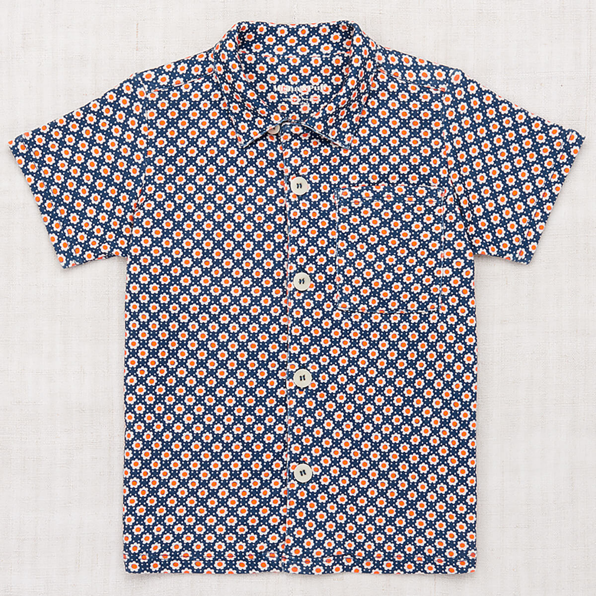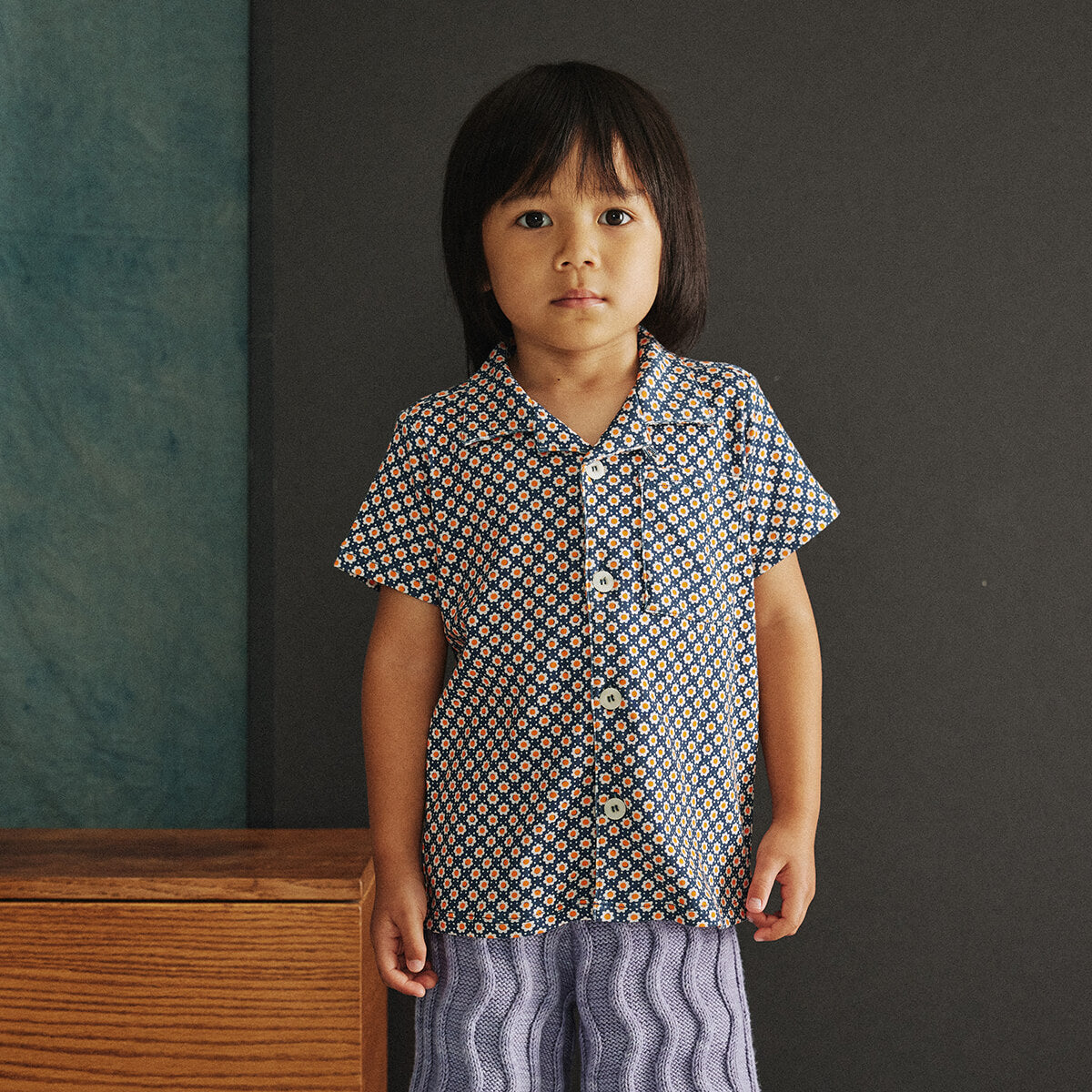 Sonny Top by Misha & Puff. A short sleeve button-up top in pima cotton, with a point collar, patch pocket, corozo button closure, and contrast topstitch detail. The perfect piece to grow with, plus a collar for layering. Featuring this season’s graphic print.