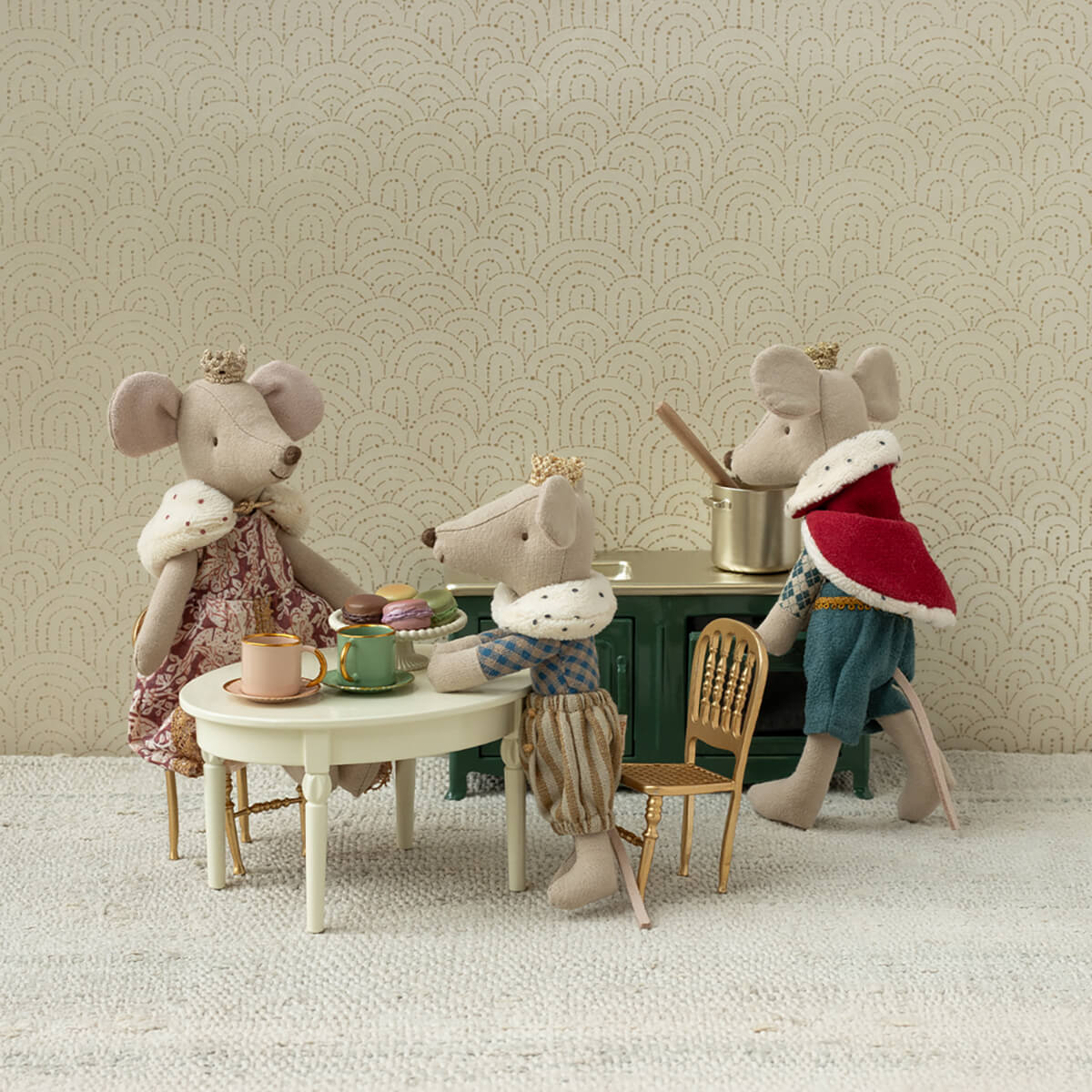 Vintage dining table for mouse by Maileg. The dining table is made for the small friends to have a place to gather and meet for a nice meal. It is made of metal and has beautifully detailed legs that fulfill the exclusive look. The table fits into the Castle.