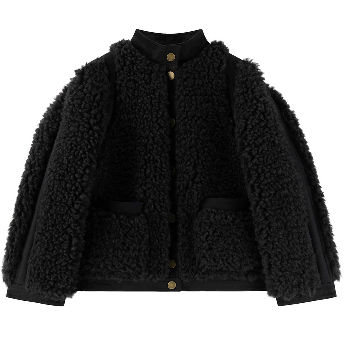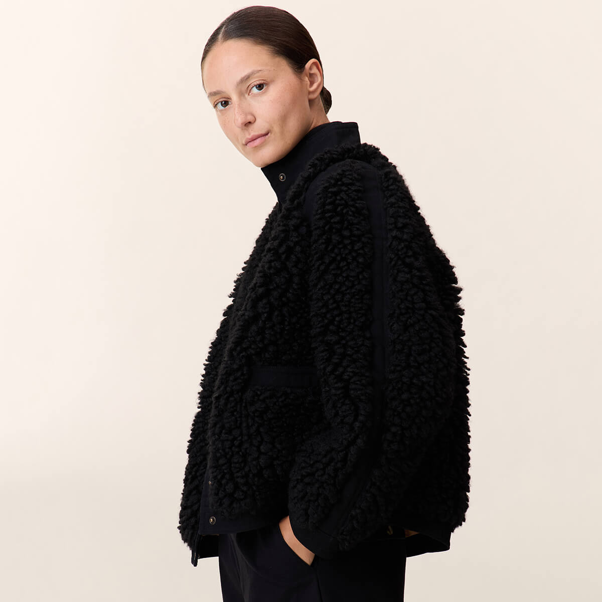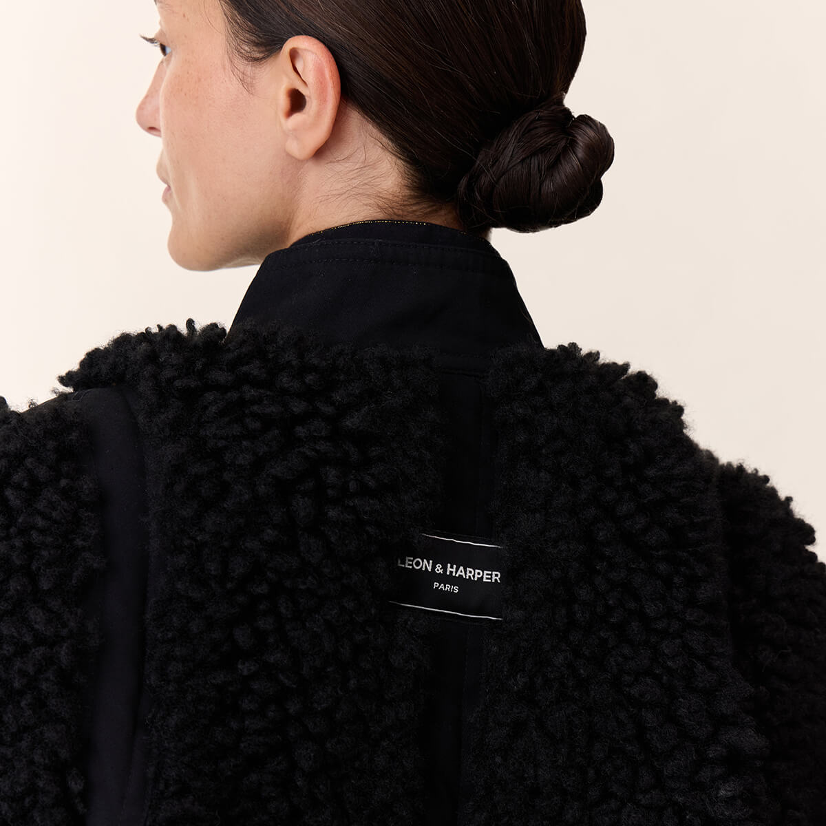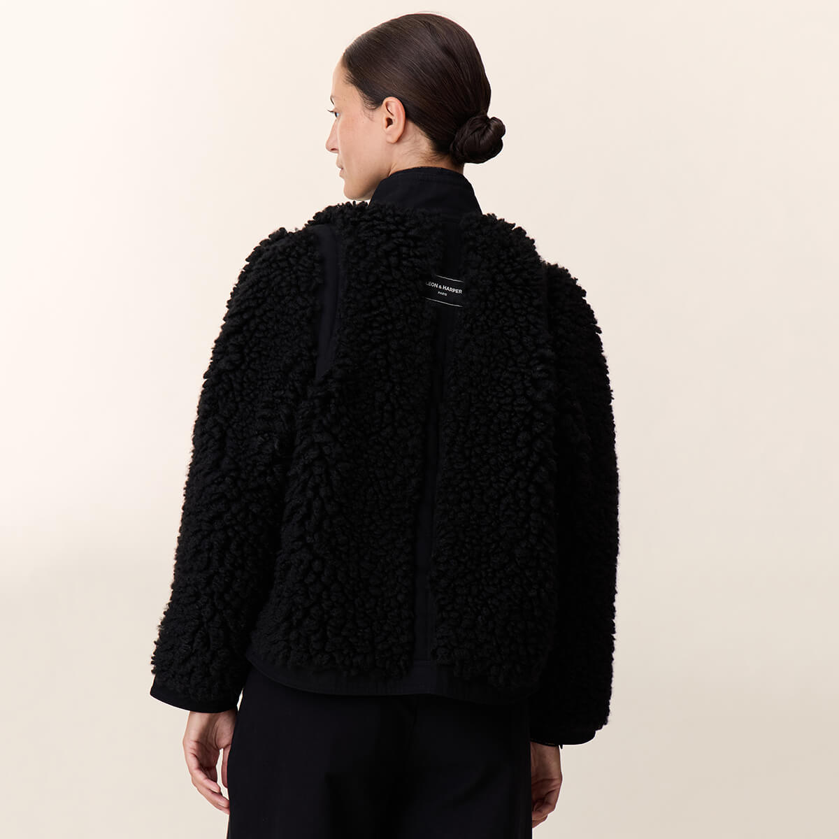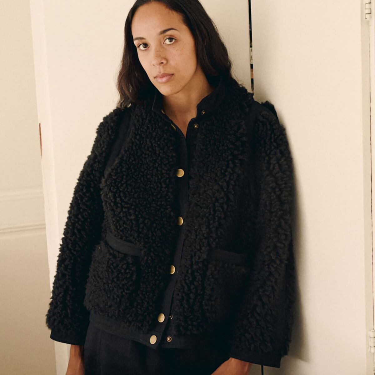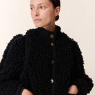 Vyvian Short Jacket by Leon & Harper. The Vyvian coat expresses the Leon & Harper spirit with its boucle texture and bold volume. The cropped, loose fit creates a modern look. The high collar warms the silhouette and fastens with a precise button placket. The round buttons and two large patch pockets define the style. Smooth fabric panels on the shoulders, along the sleeves' sides, and down the back add rhythm to the design for a contemporary contrast.