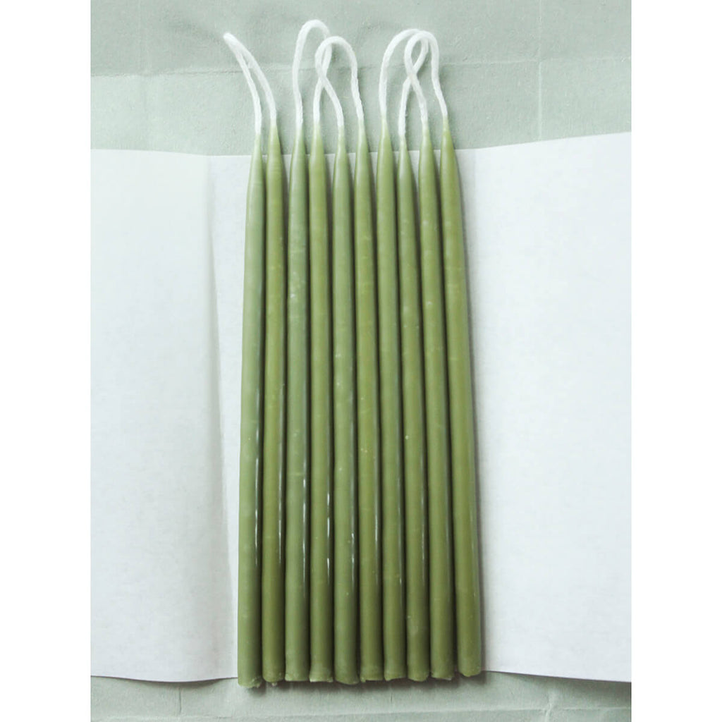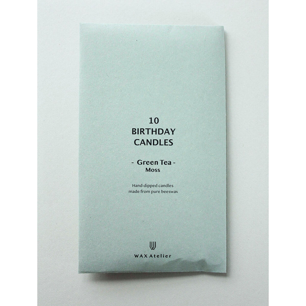 Set of ten birthday candles by Wax Atelier. A bundle of 10 long handmade candles - a beautiful addition to a cake. The green colour and scent comes from green tea, a plant based wax. These candles release a subtle aroma of matcha tea and honey. Burn time: approx 45 minutes per candle.
