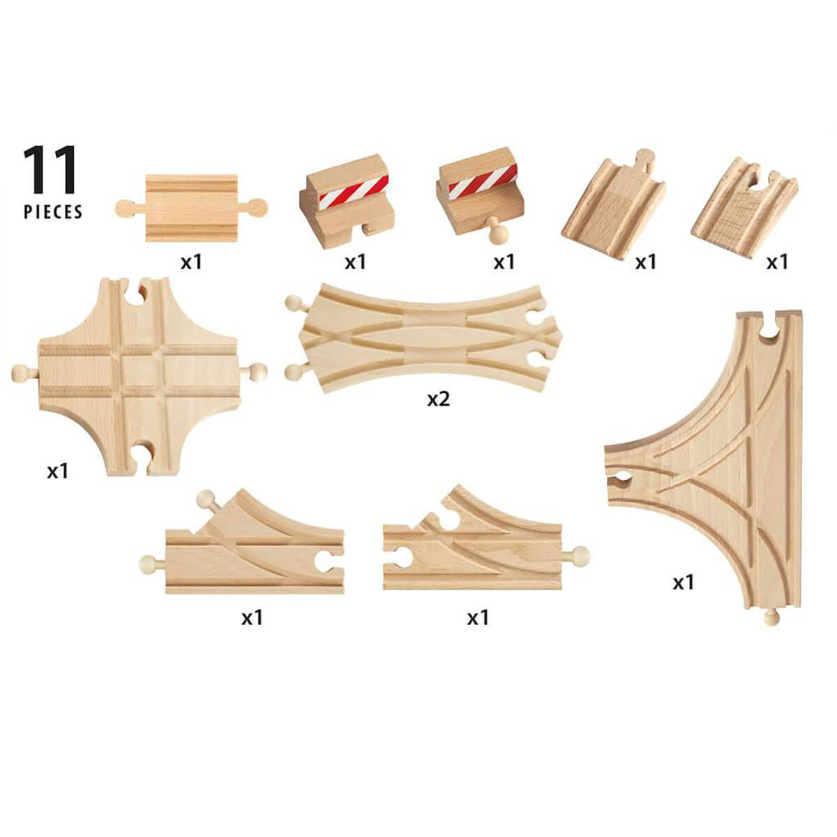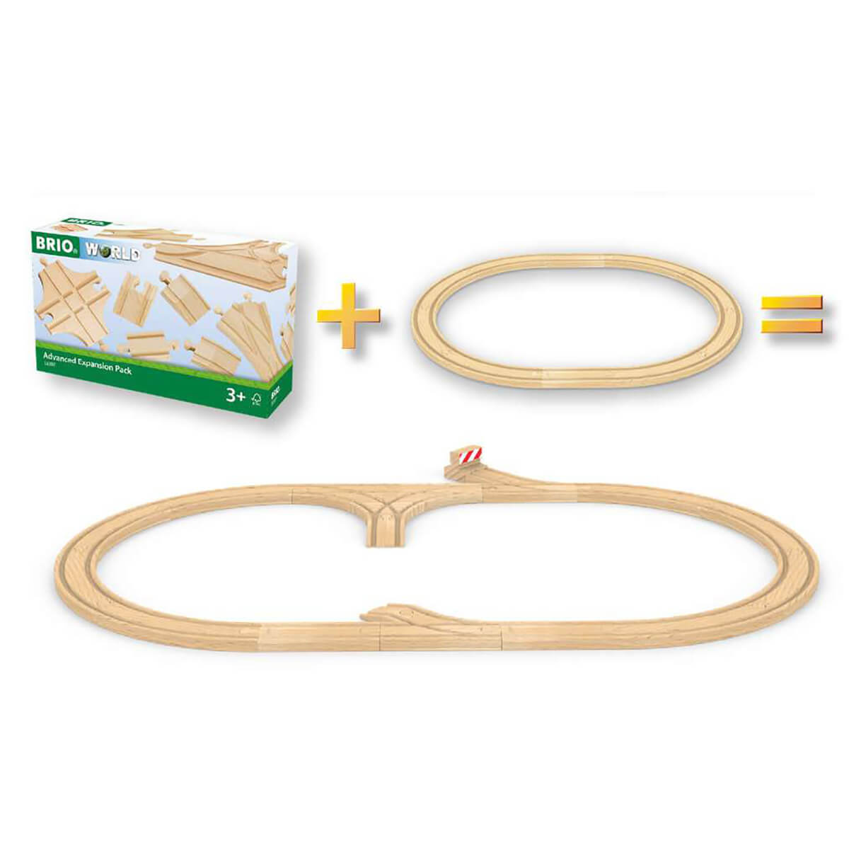Advanced expansion pack by Brio. Grow your budding engineer's collection with this amazing advanced expansion pack wooden train track accessory. A perfect expansion to extend and create new layouts This item includes 1x T Switch, 1x Cross Track, 2x Curved Crossing, 2x Switching Tracks, 2x Buffer Stops, 2x Ramp accessories, 1x Short Straight.