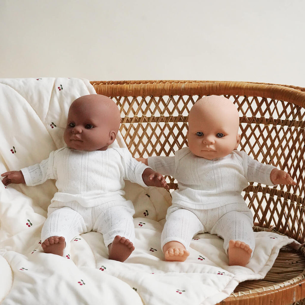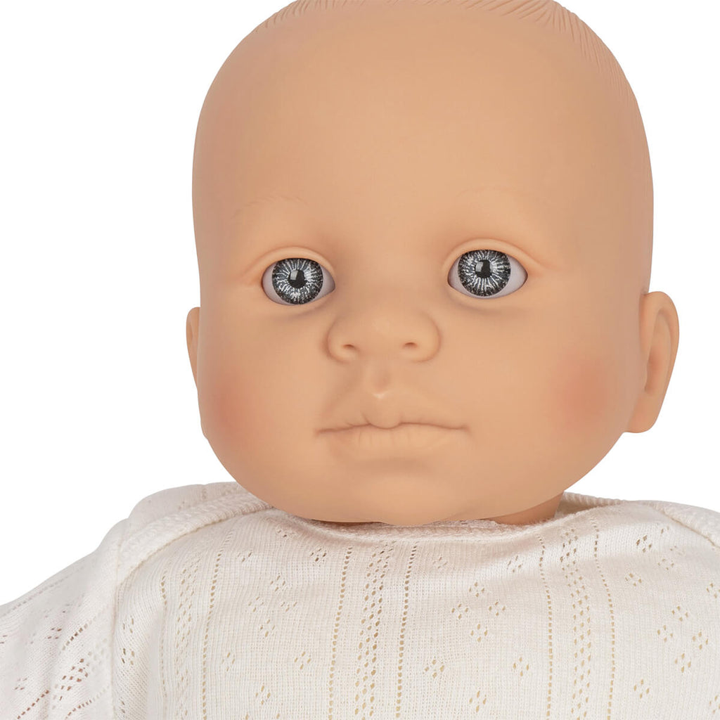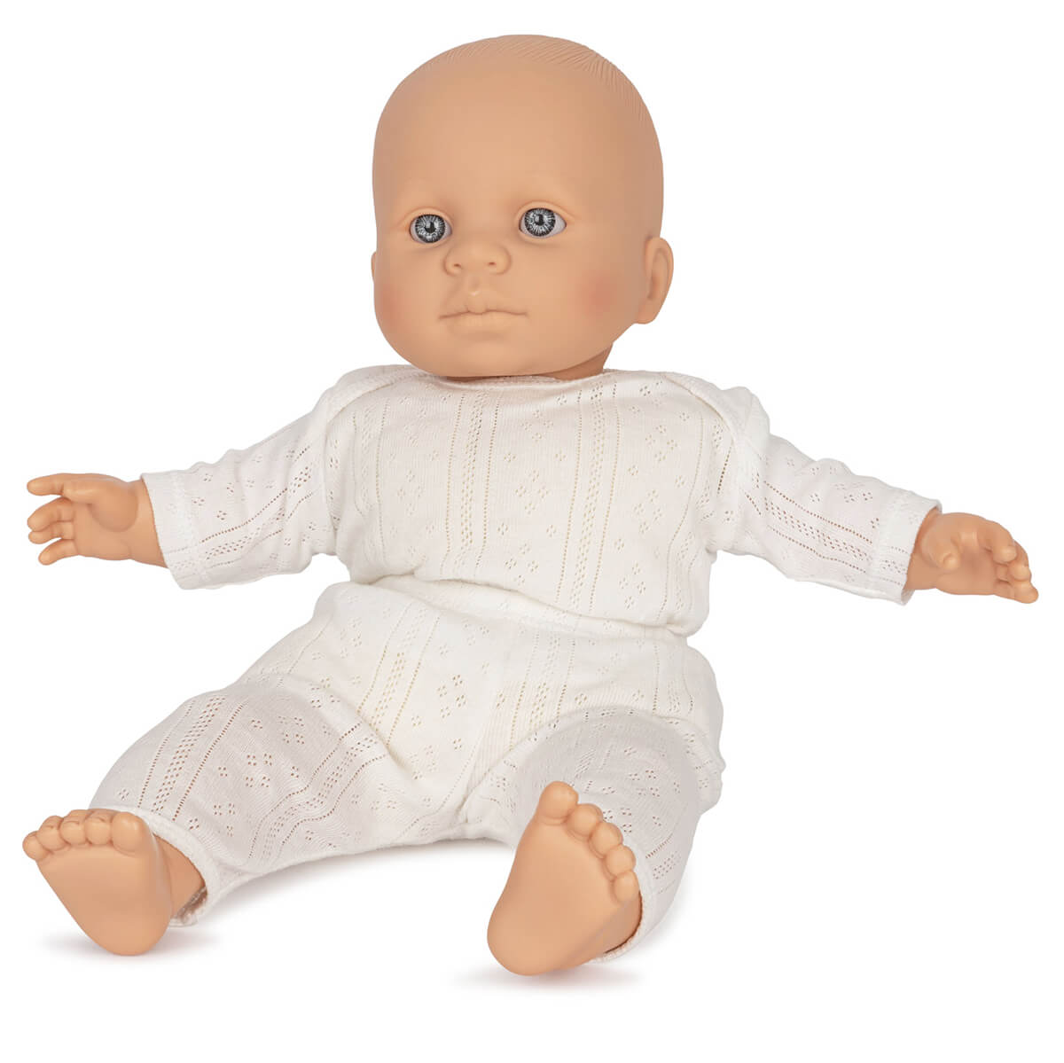 Alfie The Doll by Konges Sløjd. Poseable doll with cotton clothing, Alfie has eyes with realistic depth and colouring. Alfie’s pointelle pants and pointelle blouse are made in 100 percent organic cotton and easy for your child to take on and off.