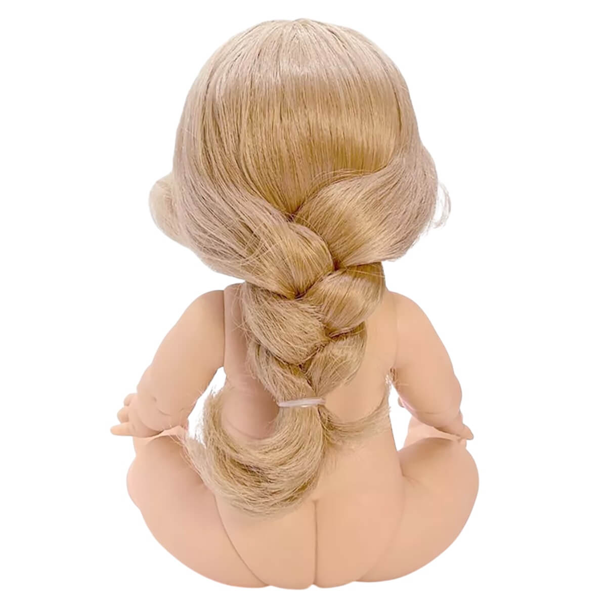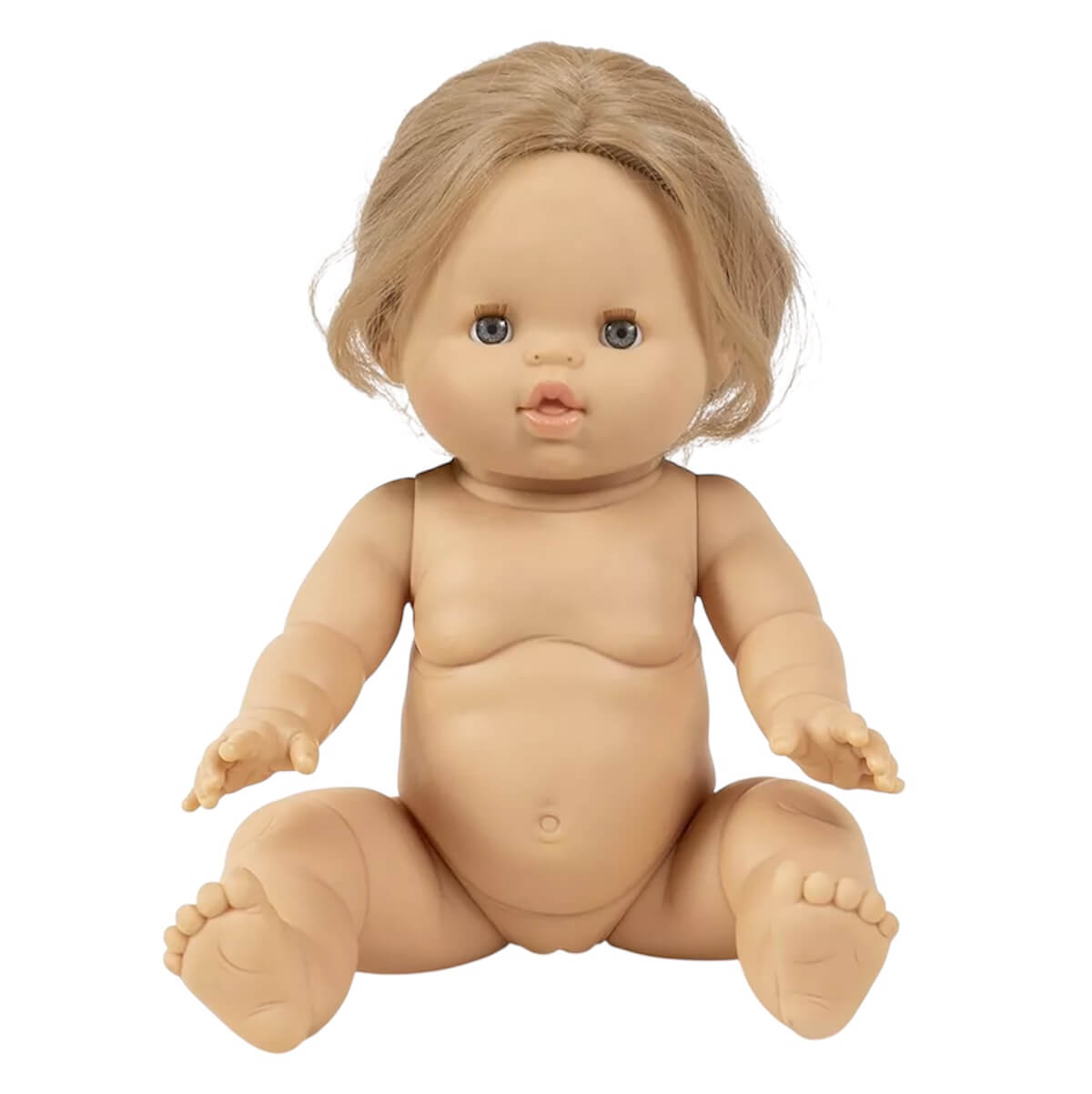Alienor girl doll by Minikane X Paola Reina. Anatomically correct doll lightly vanilla scented to smell like a newborn baby. With moveable limbs and head and sewn on hair, the doll is manufactured from non-toxic Phthalates-free vinyl, which makes it soft and flexible to touch, and very resilient.
