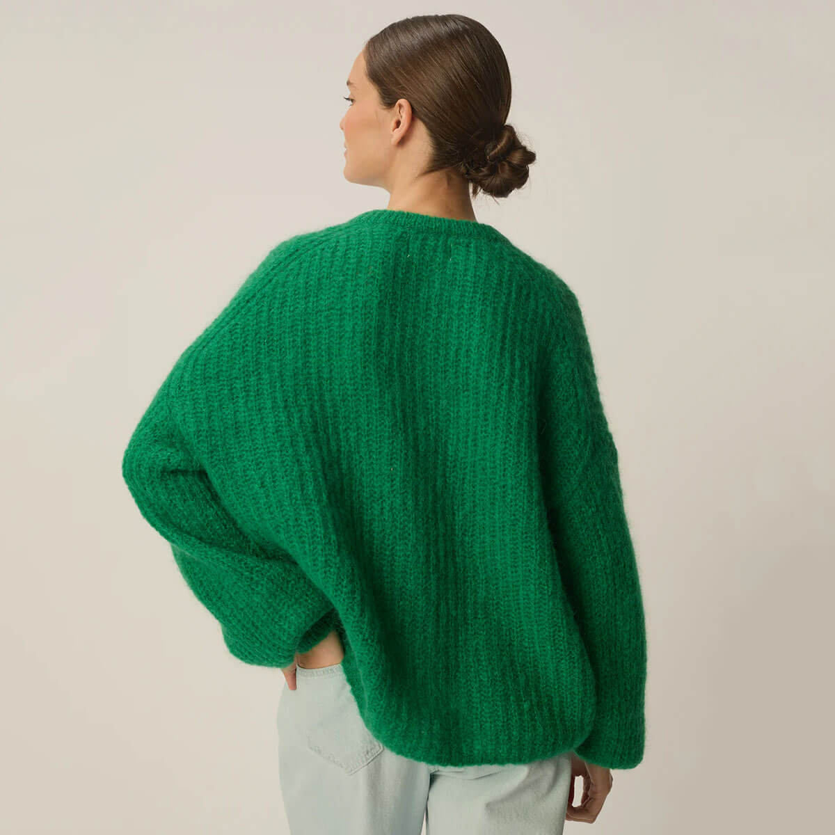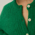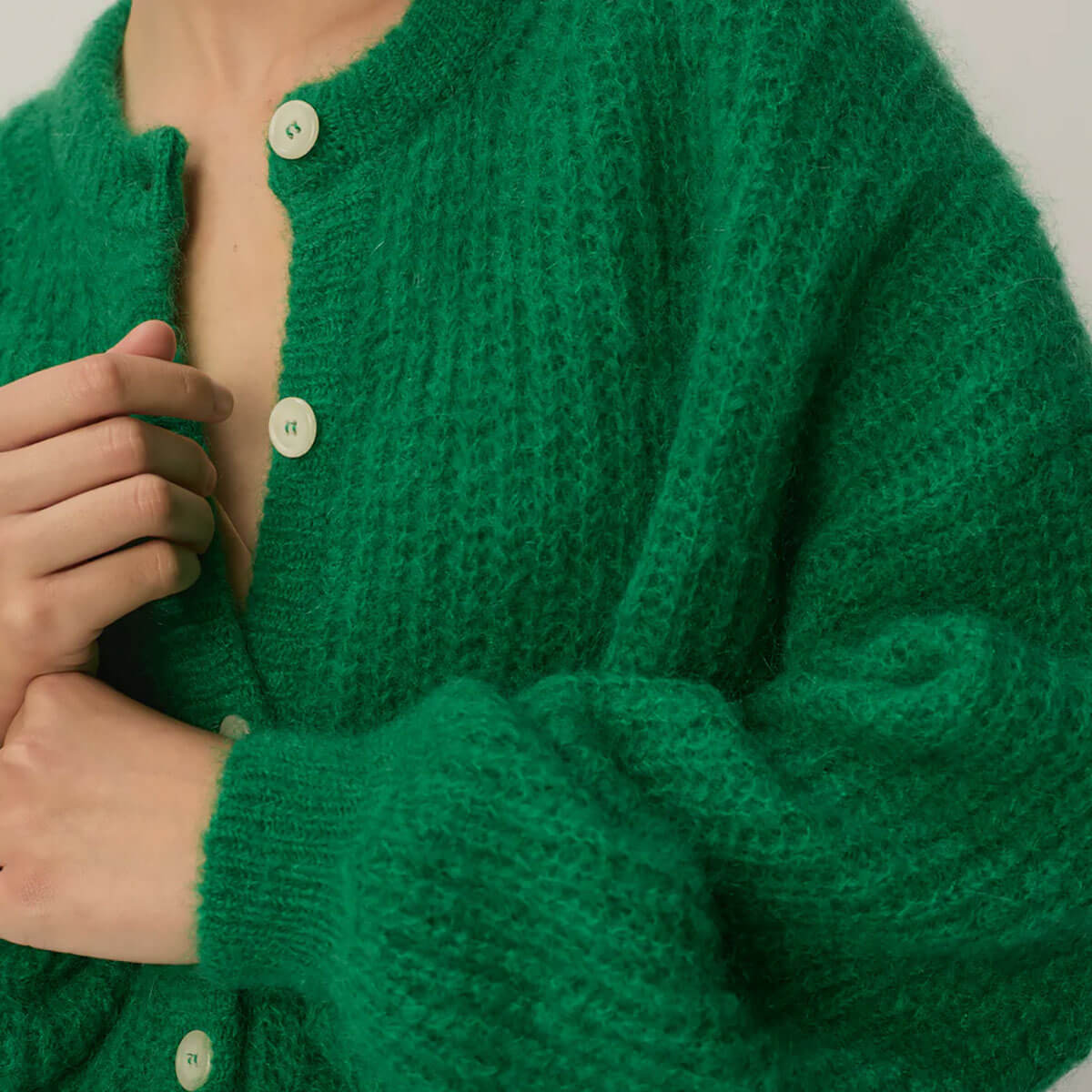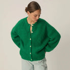 Alma Cardgian by Des Petits Hauts. A wardrobe classic updated with a slightly oversized cut, the Alma cardigan in Kid Mohair and Merino wool will define the contours of your seasonal looks. Chic and timeless, worn bloused over jeans or with a dress for a romantic silhouette, you won't be able to resist its clean and elegant drape.