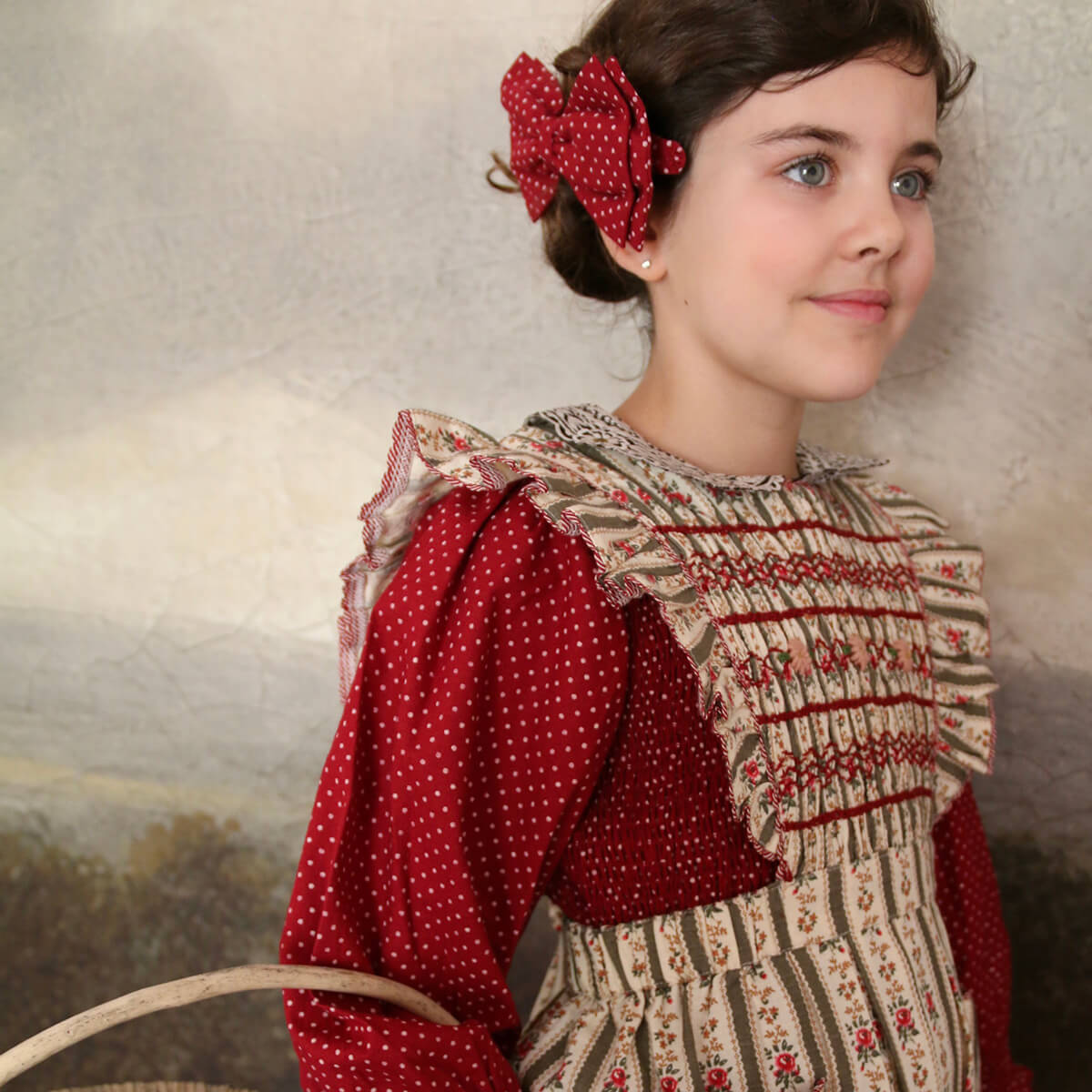 Apron Dress by Bonjour. Bonjour's signature apron dress in a seasonal floral stripe with a red dot lining.