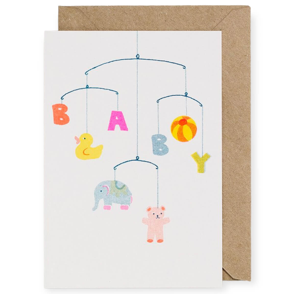 Baby Mobile new baby greetings card by Petra Boase. Risograph print using soy based flourescent coloured inks on FSC certified card. Blank inside for your own message.