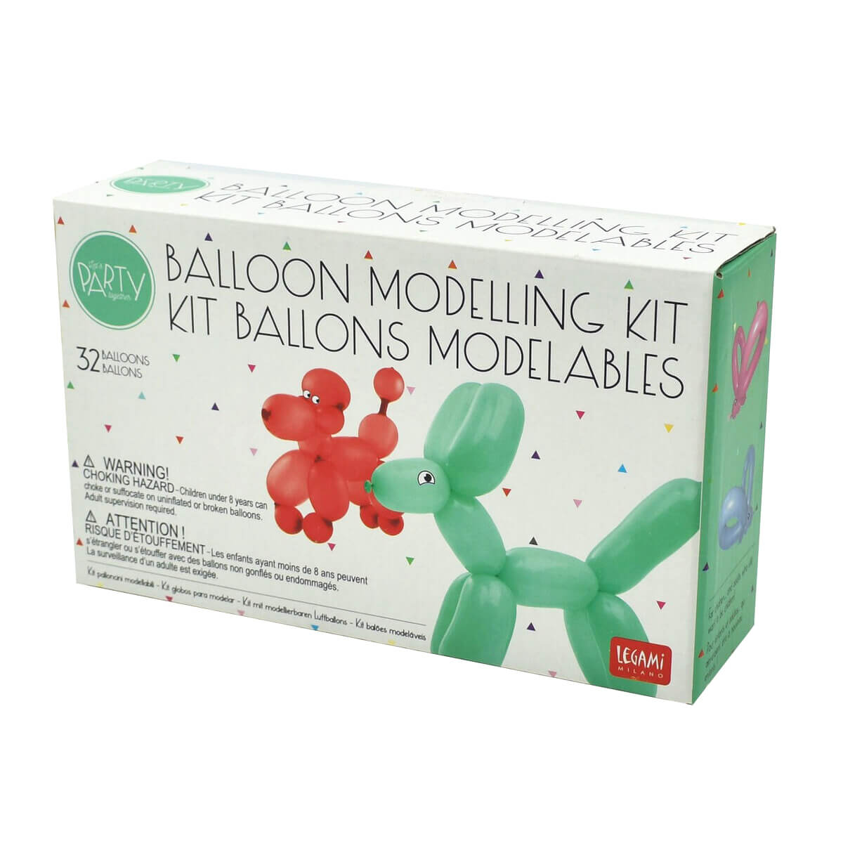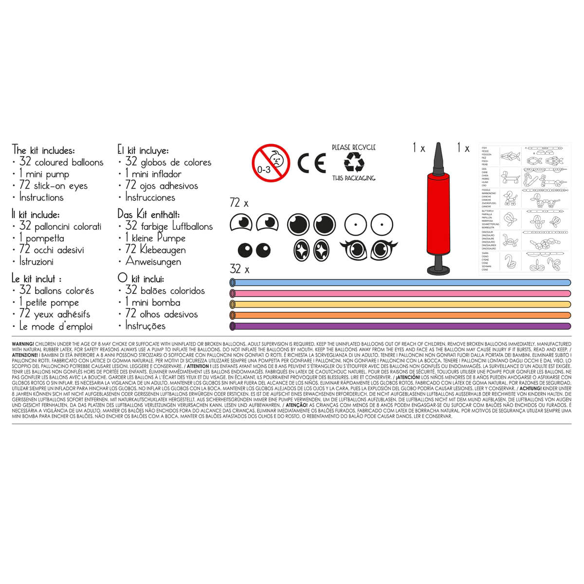 Balloon modelling kit by Legami. Contains everything you need to get the party started. Includes 32 coloured balloons, 1 mini pump, 80 stick-on eyes and instructions.