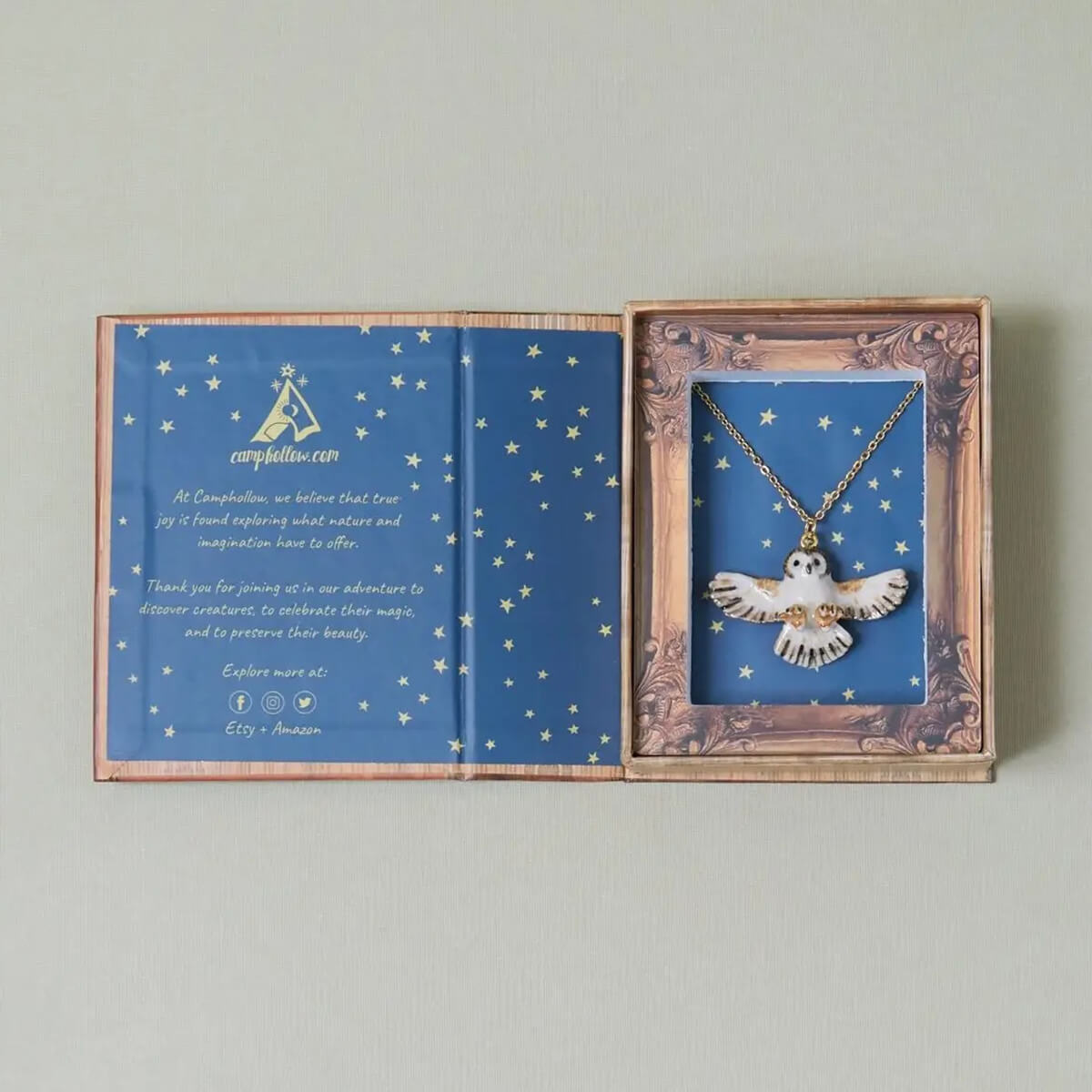 Barn Owl ceramic pendant by Camp Hollow. Hand-crafted and meticulously hand-painted porcelain animal pendant on a 24 karat gold-plated stainless steel chain. Comes in its own beautiful story book shaped gift box. Every Camp Hollow wearable is designed as a limited edition, ensuring that your special pendant animal will become a cherished heirloom for generations to come.
