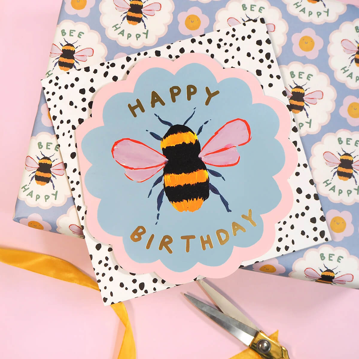 Birthday Bee shaped greetings card by Eleanor Bowmer. This Bee shaped card has cute scallop edging, dreamy pastel colours and a Happy Birthday message finished in gold foil. With the iconic Eleanor Bowmer illustrated Bee, this fun greetings card is ideal for wishing kids, friends or family a very Happy Birthday. Made from premium card stock with a luxurious silk texture and gold foil printed details. Blank inside for your own message.