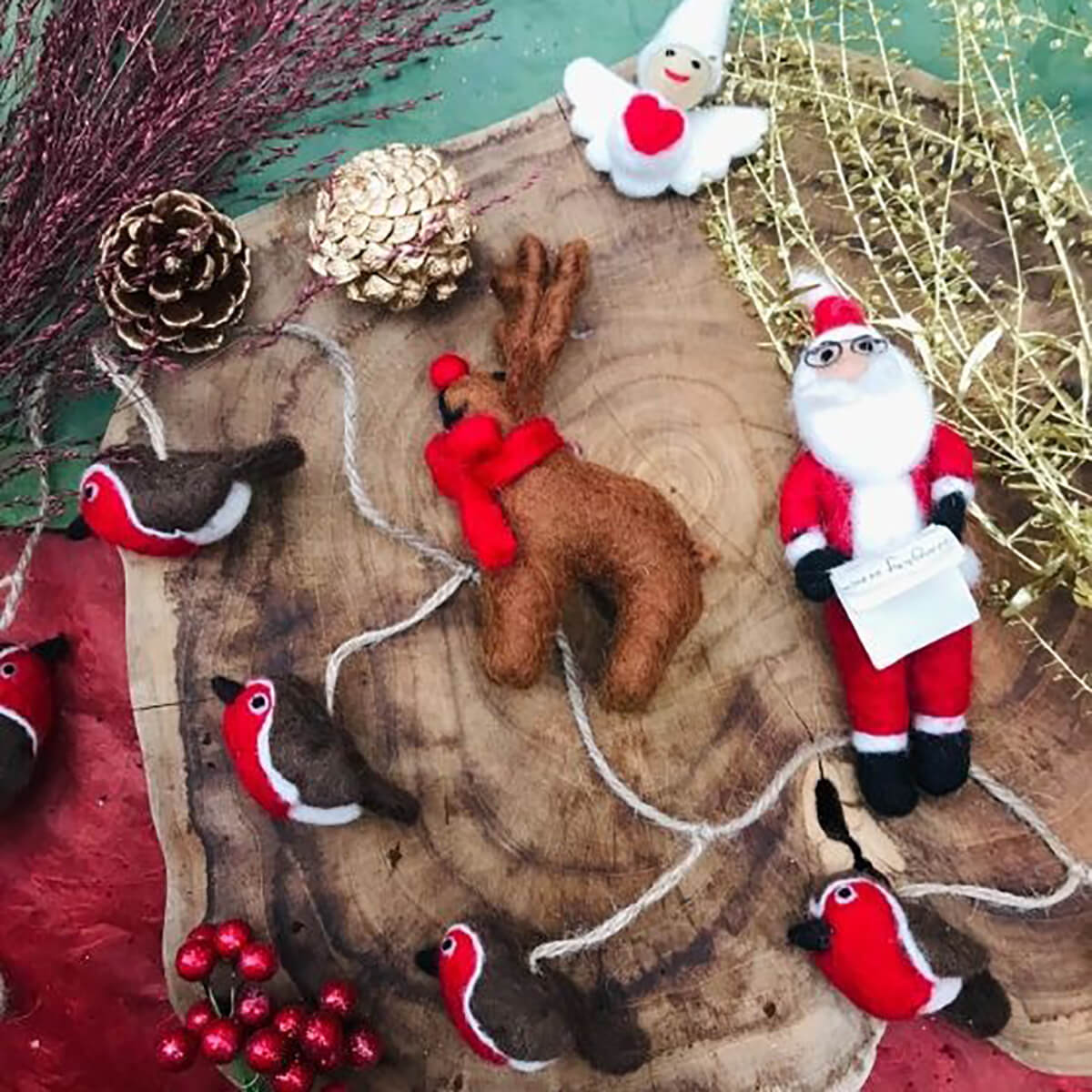 Brown Rudolph hanging Christmas decoration by Felt So Good. A classic Rudolph reindeer with a bright red nose and matching red felt scarf. Handcrafted using traditional needle felting techniques from sustainable and biodegradable materials.
