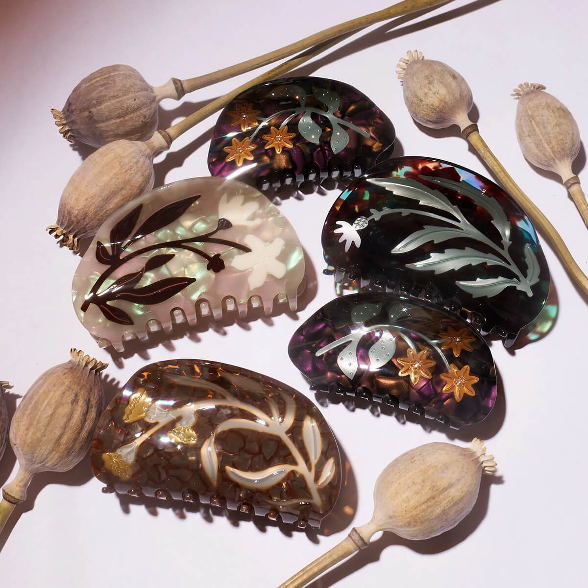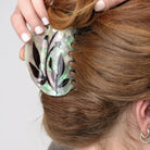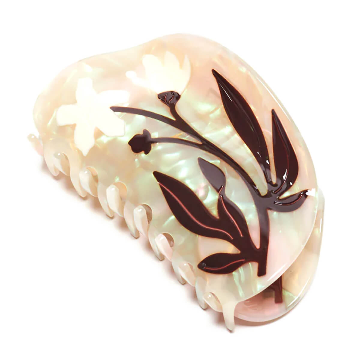 Bryony Floral XL Hair Claw by Winona Irene. The Bryony Claw features dark twisting leaves beneath bone white flowers encompassed by an ethereal bed of shimmering greens, pinks, and opal tones.