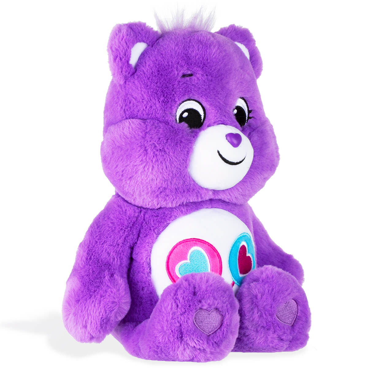 Care Bears Share Bear plush soft teddy bear by Hasbro. 14" plush Care Bear with a beany bottom to help them sit. Share Bear is has a smiling face and has appliqué love hearts on their tummy.