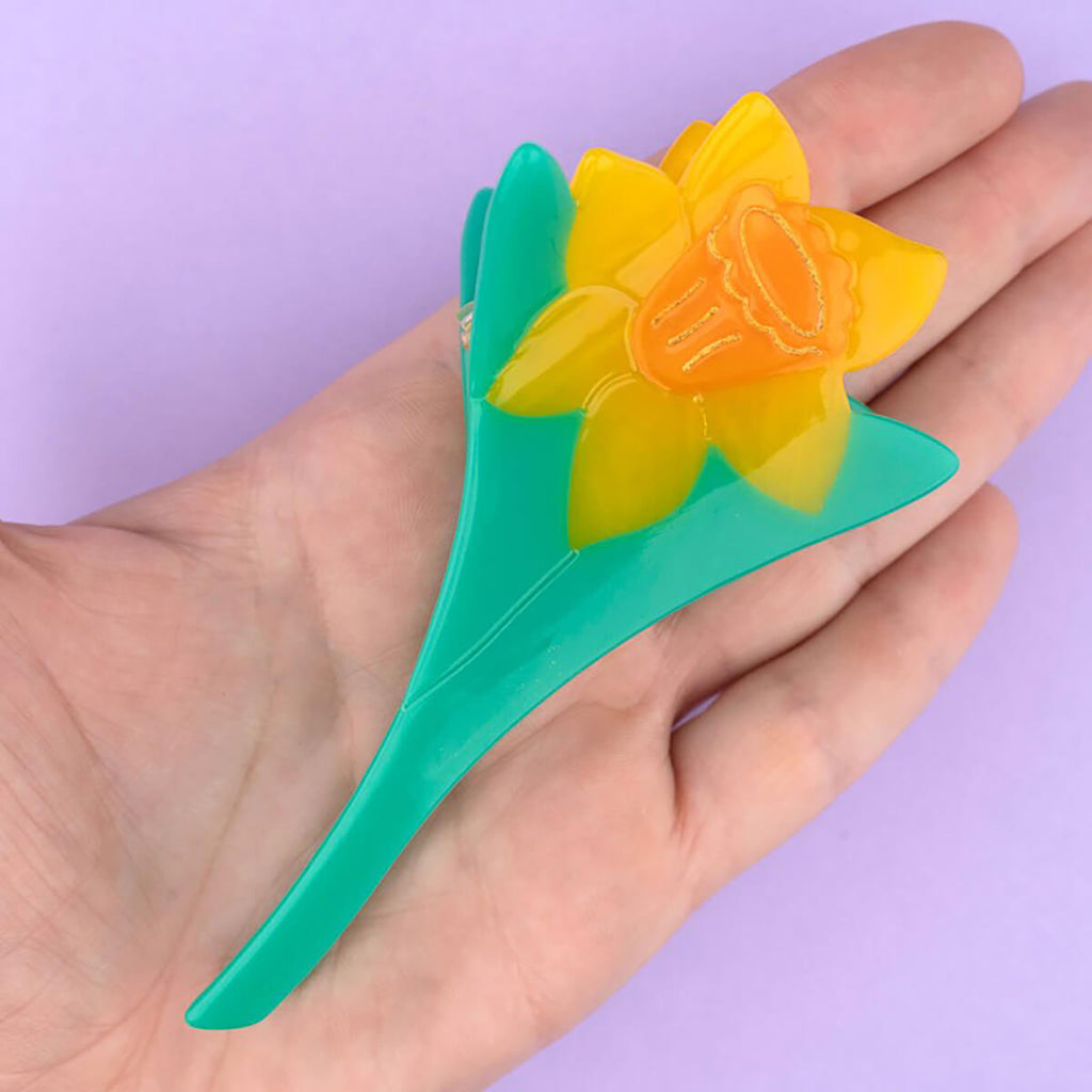 Daffodil hair claw by Coucou Suzette. An elegant full acetate single daffodil hair claw in yellow and green to bring poetry and softness to your hair-up. Made from plant-based eco-friendly cellulose acetate.