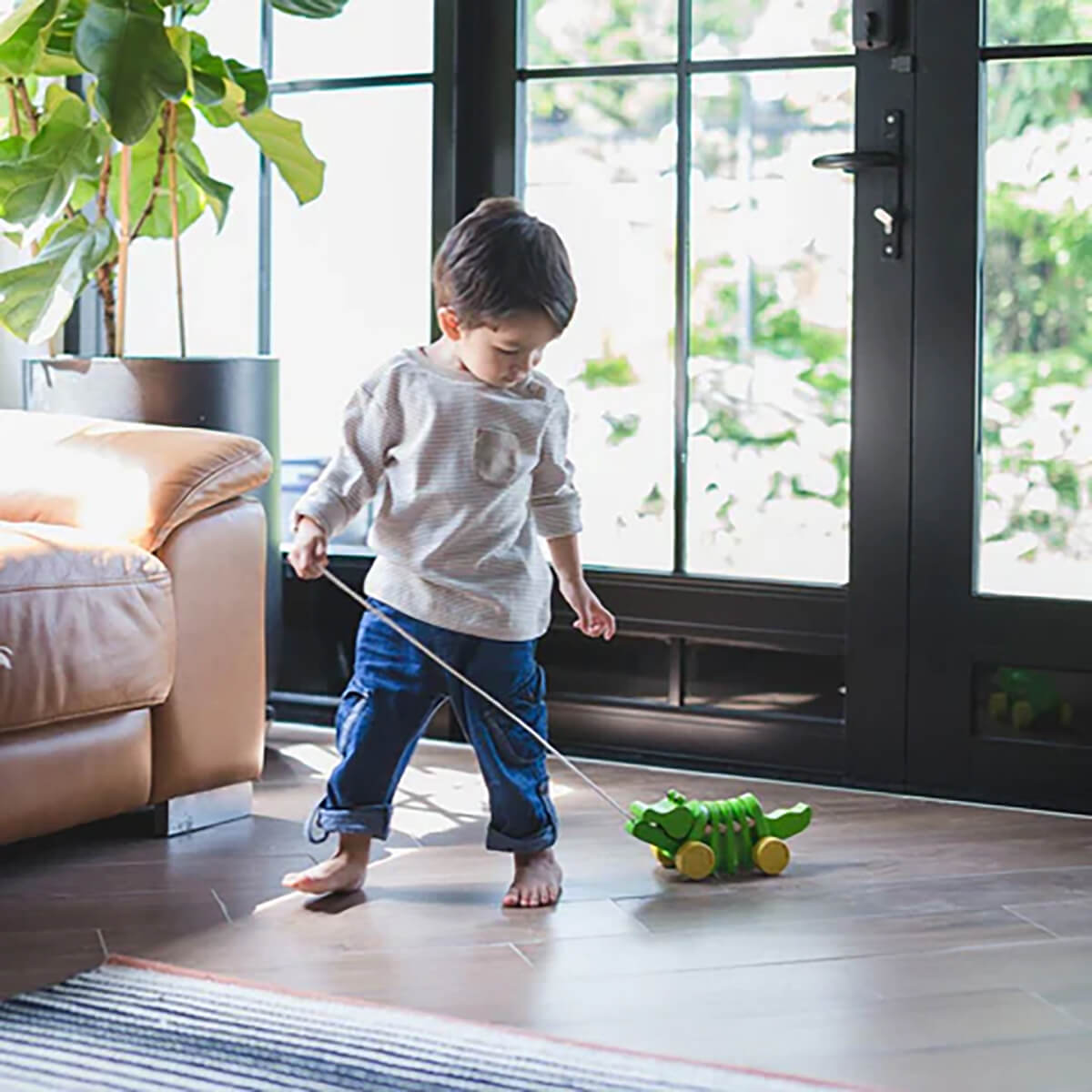 Dancing Alligator by PlanToys. When pulled, the Dancing Alligator will walk and make rhythmic click-clack sounds.